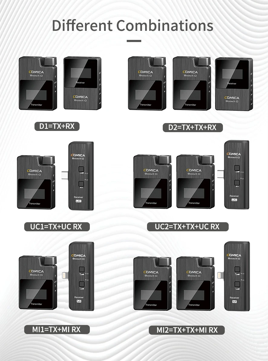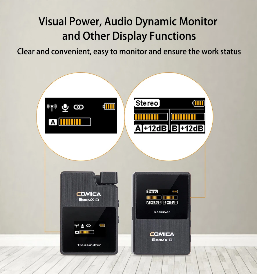 ПредисловиеСпасибо за покупку COMICA BoomX-D 2,4G цифровой 1-Trigger-2 беспроводной микрофон.Чтобы обеспечить вам хороший опыт использования, пожалуйста, внимательно прочитайте эту книгу перед использованием и правильно установите и действуйте.Основные характеристики. 2,4G Цифровая беспроводная, Глобальная свободная частота. Двойные передатчики, срабатывающие одним приемником. Визуальная мощность, аудио динамический монитор и другие функции отображения. Внутренний и внешний микрофон два входных режима. Моно/стерео переключаемые режимы вывода. Аудио монитор в реальном времени. Качество вещания аудио. Технология RF, Auto Freq. Регулировка, стабильная передача. Низкая задержка <20 мс. Рабочий диапазон до 50 м. Разработан с многофункциональным зажимом для ремня и компактнымПараметрыПередатчик (TX)Беспроводной диапазон 2400 ~ 2483,5 МГцПередающая Мощность + 10dBmЧувствительность приема-86dBmАнтенна PCB антеннаПолярный узор всенаправленныйЧастотная характеристика 80 Гц ~ 20 кГцЗадержка звука <20 мсВнешний входной интерфейс микрофона 3,5 мм TRSБатарея Встроенная литий-ионная Батарея 300 мА/ч, 3,7 VСрок службы батареи 5 часовВес нетто 29 гРазмер 39x22x55 ммРабочая температура 0 ℃ ~ 50 ℃Приемник (RX)Беспроводной диапазон 2400 ~ 2483,5 МГцПередающая Мощность + 10dBmЧувствительность приема-86dBmАнтенна PCB антеннаАмплитуда аудиовыхода + 0 дБ ~ + 12 дБЗадержка звука <20 мсИнтерфейс аудиовыхода 3,5 мм TRSИнтерфейс монитора 3,5 мм TRS/TRRSБатарея Встроенная литий-ионная Батарея 300 мА/ч, 3,7 VСрок службы батареи 5 часовВес нетто 29 гРазмер 39x22x55 ммРабочая температура 0 ℃ ~ 50 ℃