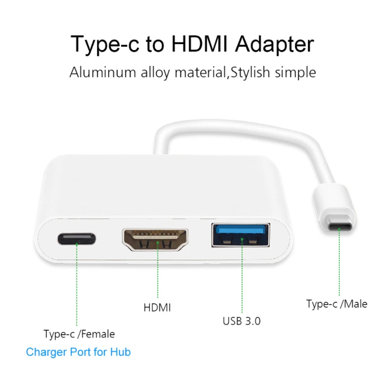 3 в 1. Зарядный адаптер USB 3,1 Type-C к HDMI + USB3.0 + Type-C/F помогает подключать компьютер с портом type C к дисплею. Монитор/проектор/HDTV с портом HDMI и другими устройствами (мышь, USB флэш-диск, клавиатура и т. д.) с портом USB3.0.