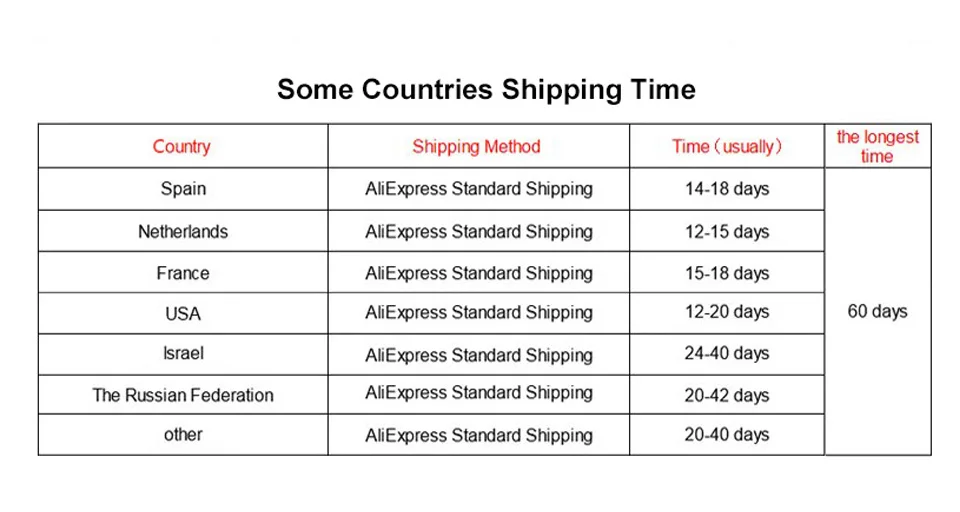 1. Большинство пакетов имеют номер для отслеживания, прикрепляемый в течение 1-7 рабочих дней2. Перед размещением заказа убедитесь, что ваш адрес указан верно или полностью.3. Мы рекомендуем использовать стандартный способ транспортировки «AliExpress».4. Расчетная дата доставки будет зависеть от таможни, местной логистики, погоды и некоторых неконтролируемых факторов. Иногда доставка посылка ЛКИ может занять больше времени,Пожалуйста, свяжитесь с нами, чтобы продлить время защиты вашего заказа.