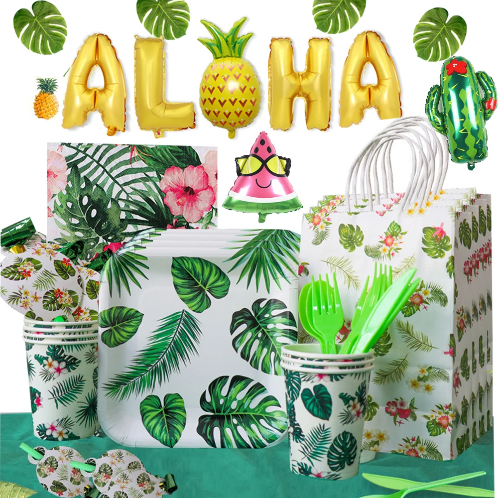 Гавайская посуда, фламинго, искусственное украшение для вечерние, зеленые воздушные шары с пальмовым листьем, праздничные летние праздничные принадлежности для вечеривечерние Luau Aloha
