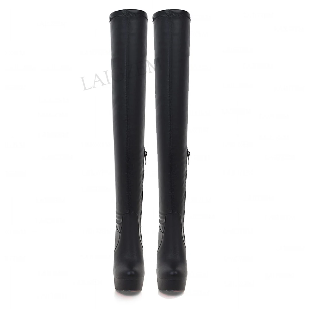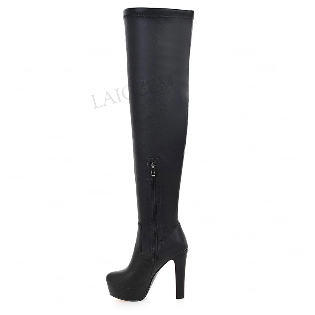 LAIGZEM/очень женская обувь; Высота платформы по колено; Сапоги на толстом высоком каблуке; Цвет черный, белый; Zapatos Botas Mujer; Большие размеры 42, 44, 46, 48
