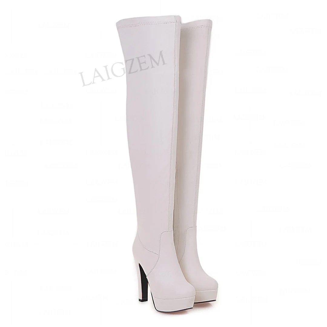 LAIGZEM супер женские ботфорты Высота платформы по колено сапоги На высоких толстых каблуках сапоги черный, белый цвет; Zapatos Botas Mujer; Большой размер 42, 44, 46, 48
