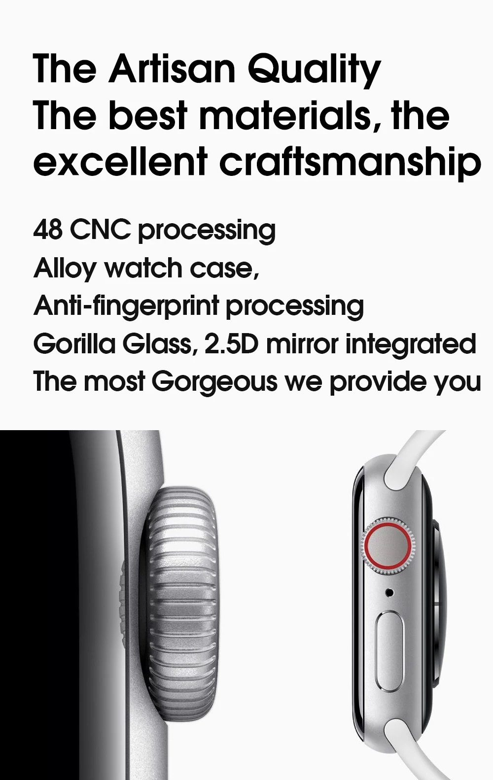 Беспроводное зарядное устройство, Bluetooth Вызов, пользовательские Циферблаты часов, температура тела, частота сердечных сокращений, BP & ECG, шаг, 44 мм сменный ремешок, умное сотовое меню, меню 9 приложений, IP68 водонепроницаемый, кнопка вращения, приложение для часов