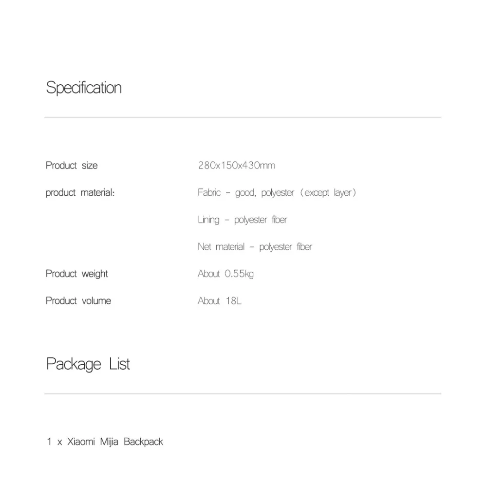 Бренд Xiaomi Материал Полиэстер Материал подкладки Полиэстер Сетчатый материал Полиэстер Ёмкость 18л Размеры 280x150x430 мм/11,02x5,91x16,93 дюймов Цвет Черный, темно-серый, темно-синий, синий светильник Вес 550 гОсобенности:Классический деловой стиль путешествий.