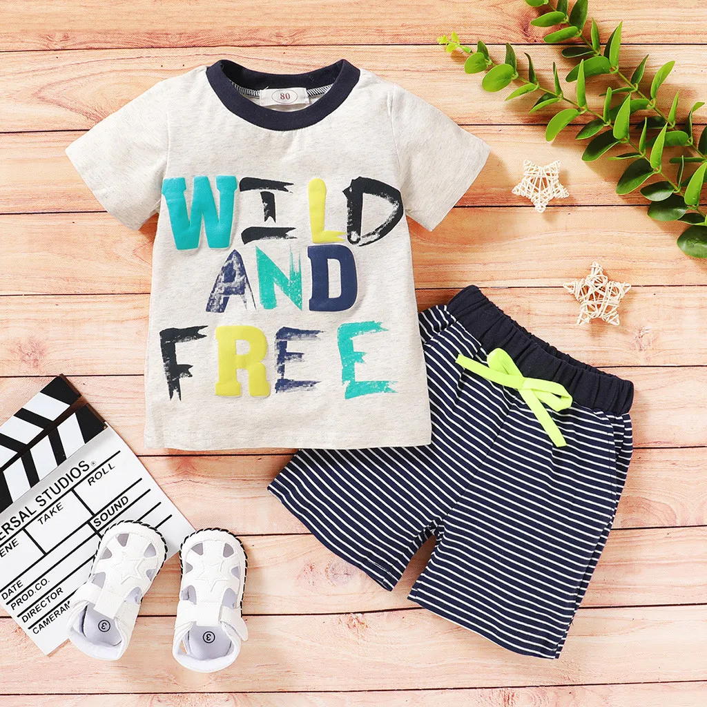 Футболка с надписью для маленьких мальчиков, топы + Полосатые комплект с шортами