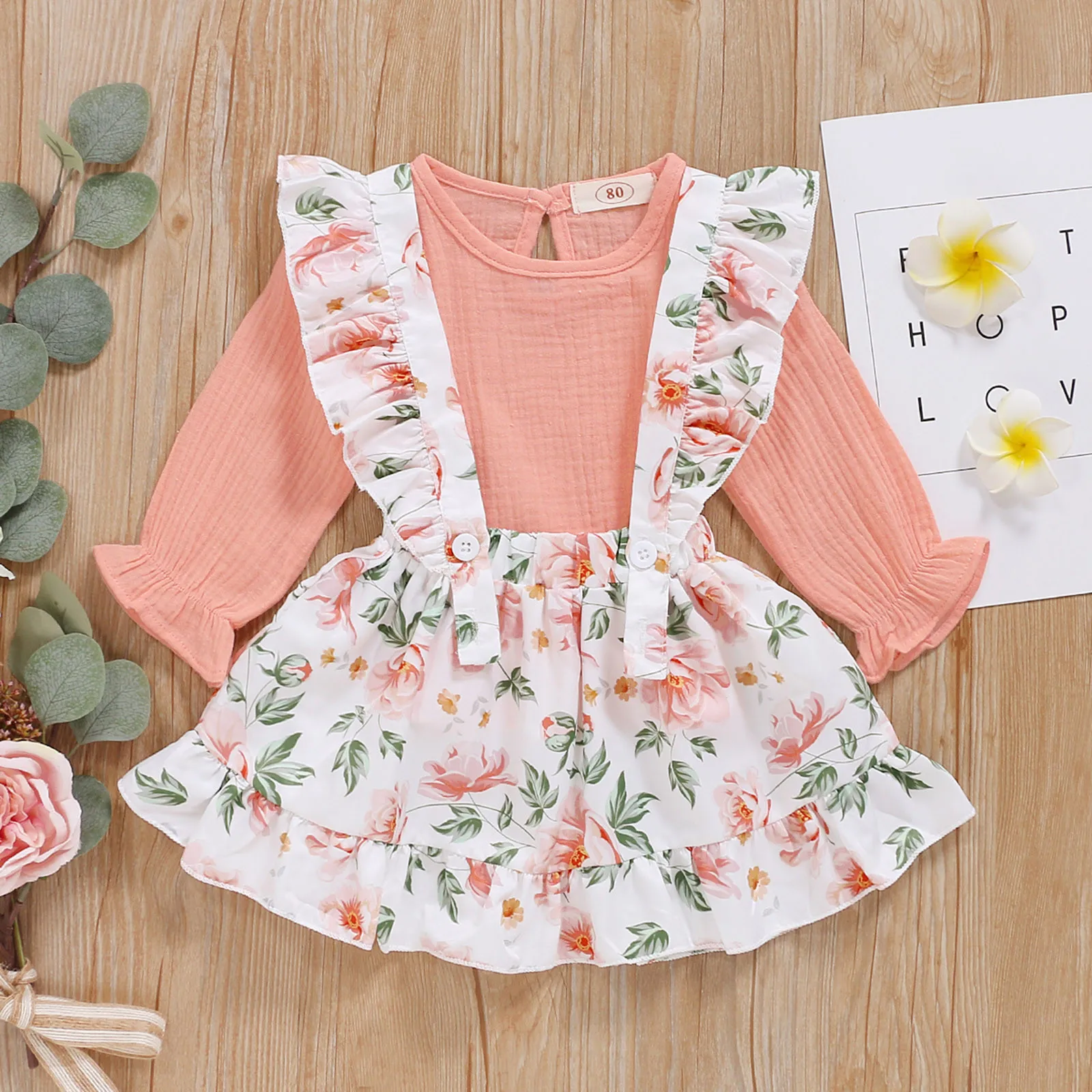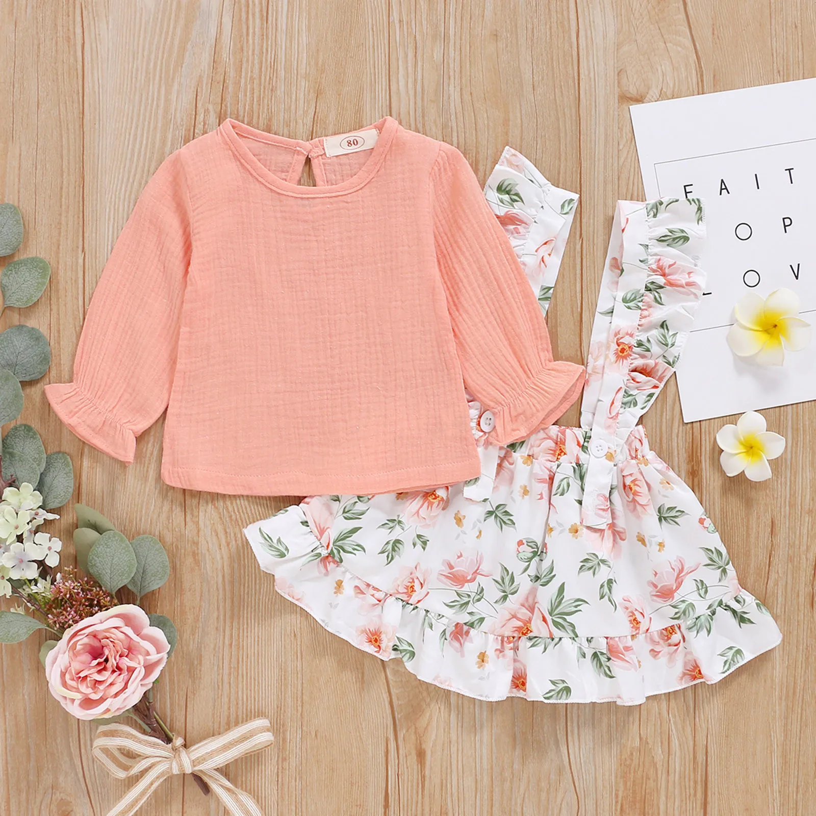 Топы с длинными рукавами для маленьких девочек + юбка с цветочным принтом и оборками на подтяжках