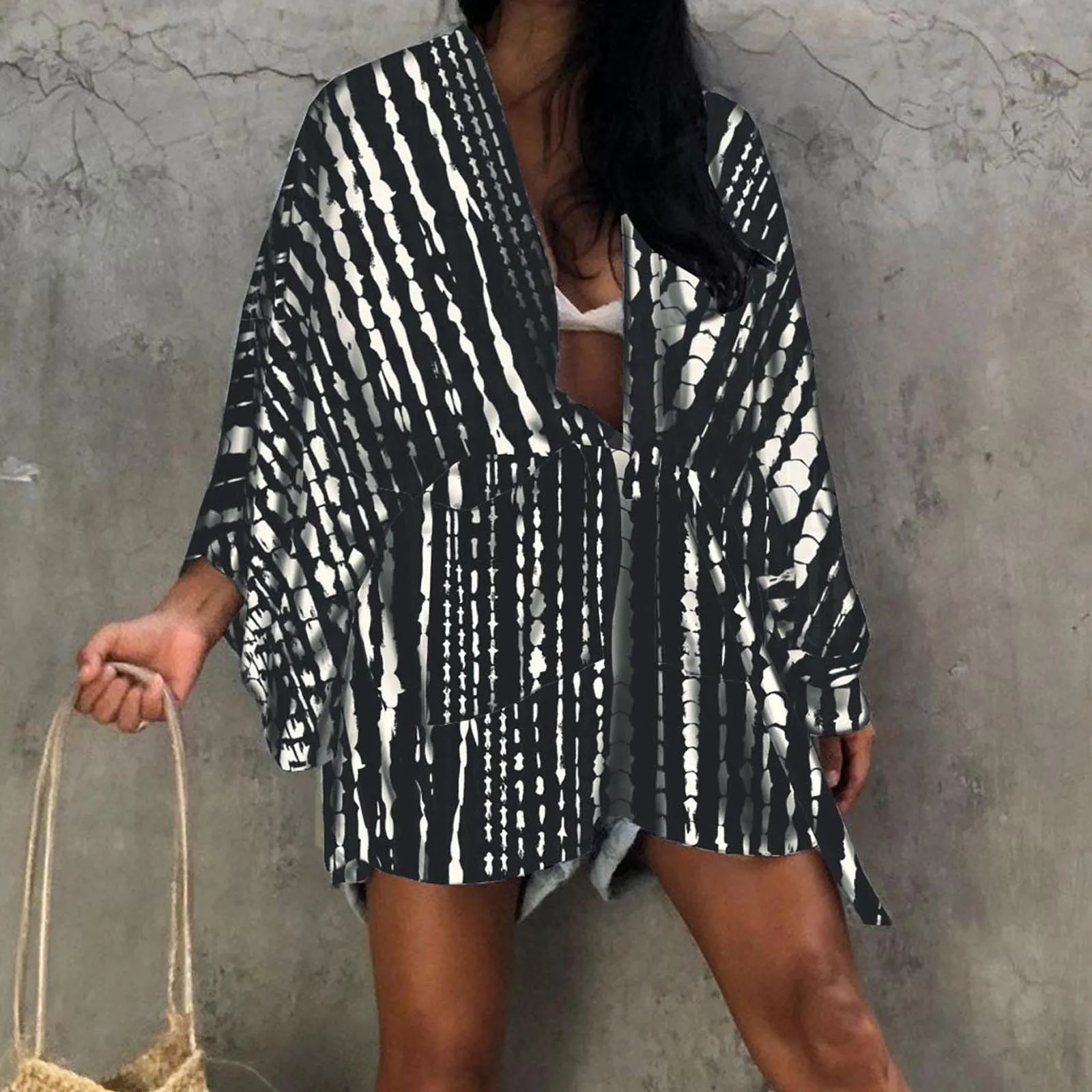 Стиль: идеально подходит как уличная одежда, пляжная одежда, одежда для отдыха, повседневное кимоно, Пляжный купальный костюм накидка, модная шифоновая блузка, сексуальный пляжный чехол Топ, тонкое пальто на весну, лето, осень и т. д. Универсальный гардероб Штапель как для жарких дней на улице, так и для холодного кондиционирования воздуха в помещении