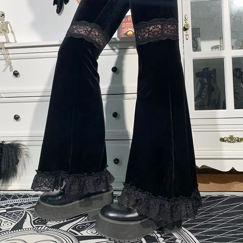 Брюки-клеш с высокой талией Mall Goth, эстетичные сексуальные кружевные брюки в стиле пэчворк, Женские винтажные Элегантные Бархатные рождественские Брюки