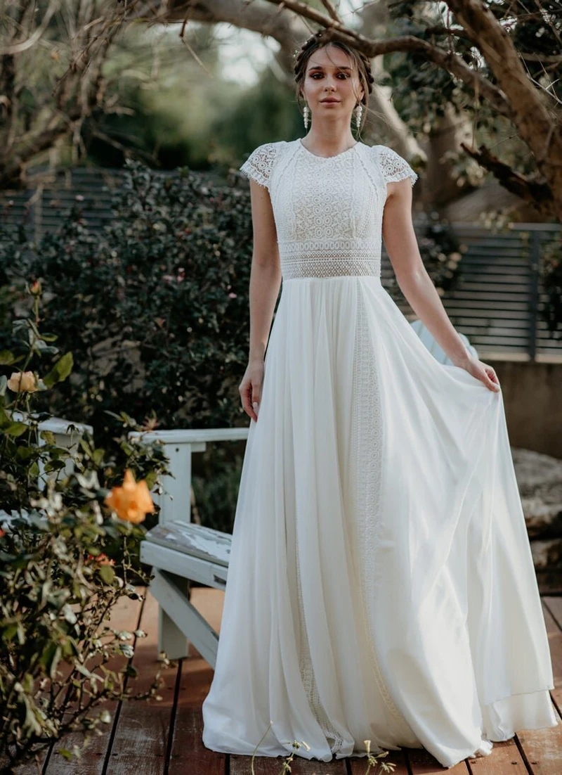 Свадебное Платье с короткими рукавами в стиле бохо, кружевное Платье невесты Платье шифон пляж, длинное винтажное Платье для женщин 2021, Свадебное Платье