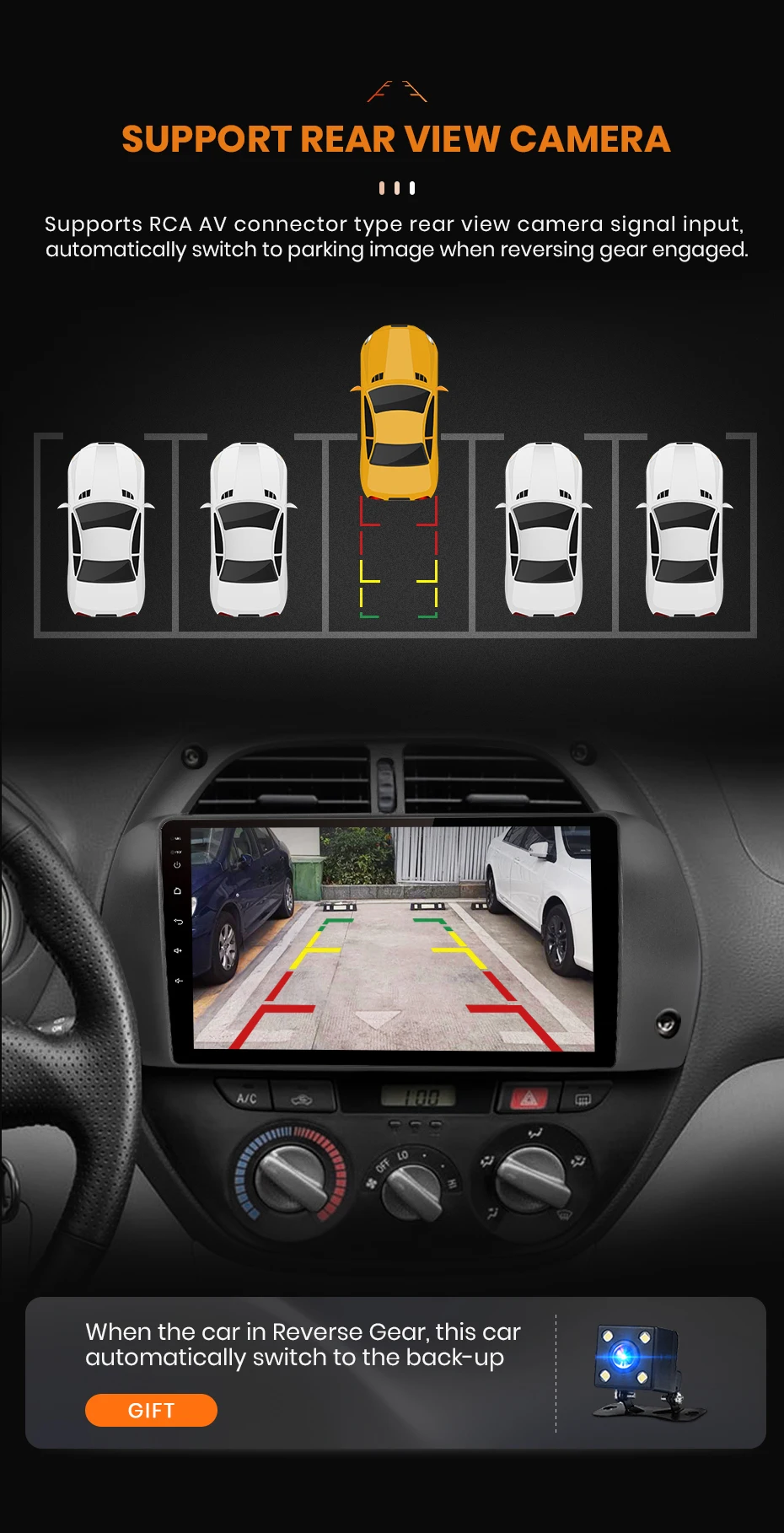 С камерой заднего вида мультимедийный плеер AWESAFE PX9 поворачивается на обратный экран с помощью линии парковки, чтобы помочь парковке. (Примечание: камера заднего вида включена в качестве бесплатного подарка, не нужно покупать.)