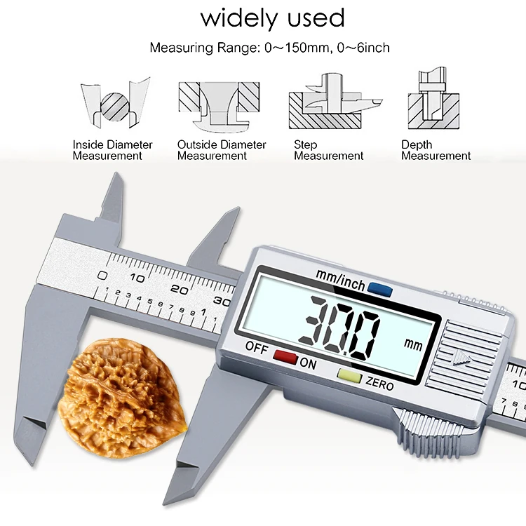 2. Правильный Диапазон измерения: Диапазон измерений составляет от 0-150 мм, минимальный диапазон чтения 0,1 мм/0.01in, подходит для измерения различных продуктов.