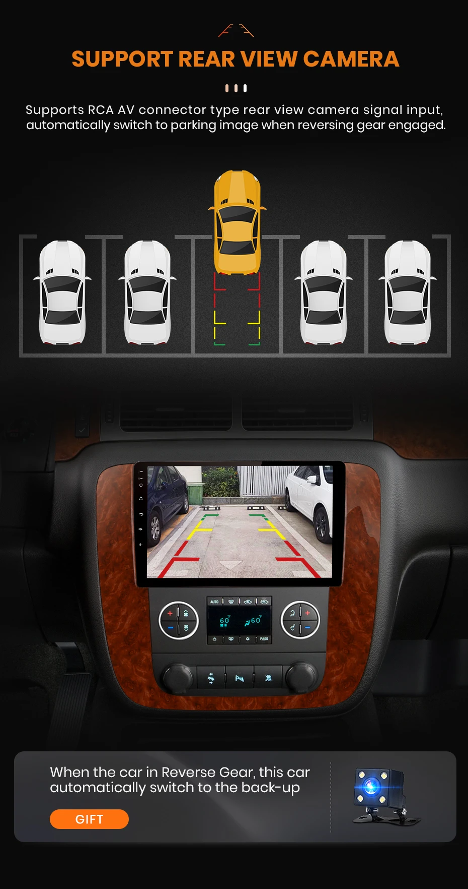 С камерой заднего вида мультимедийный плеер AWESAFE PX9 поворачивается на обратный экран с помощью линии парковки, чтобы помочь парковке. (Примечание: камера заднего вида включена в качестве бесплатного подарка, не нужно покупать.)