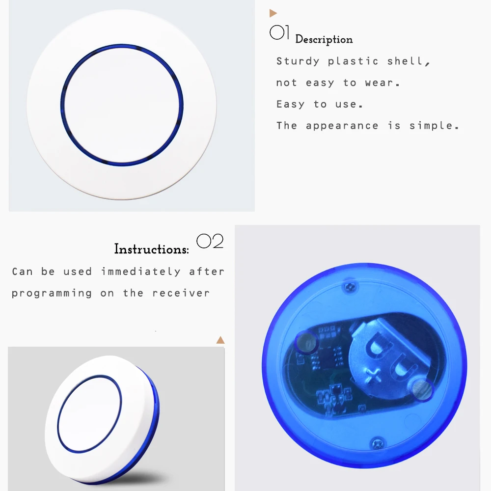 Цвет: белый и синий, белый и желтый Рабочее напряжение: 3 в Батарея: CR2016 (включая) Рабочая частота: 433 МГц. Кодирующий чип: EV1527 (код обучения). Количество клавиш: 1 Размер: 50 мм * 11 мм