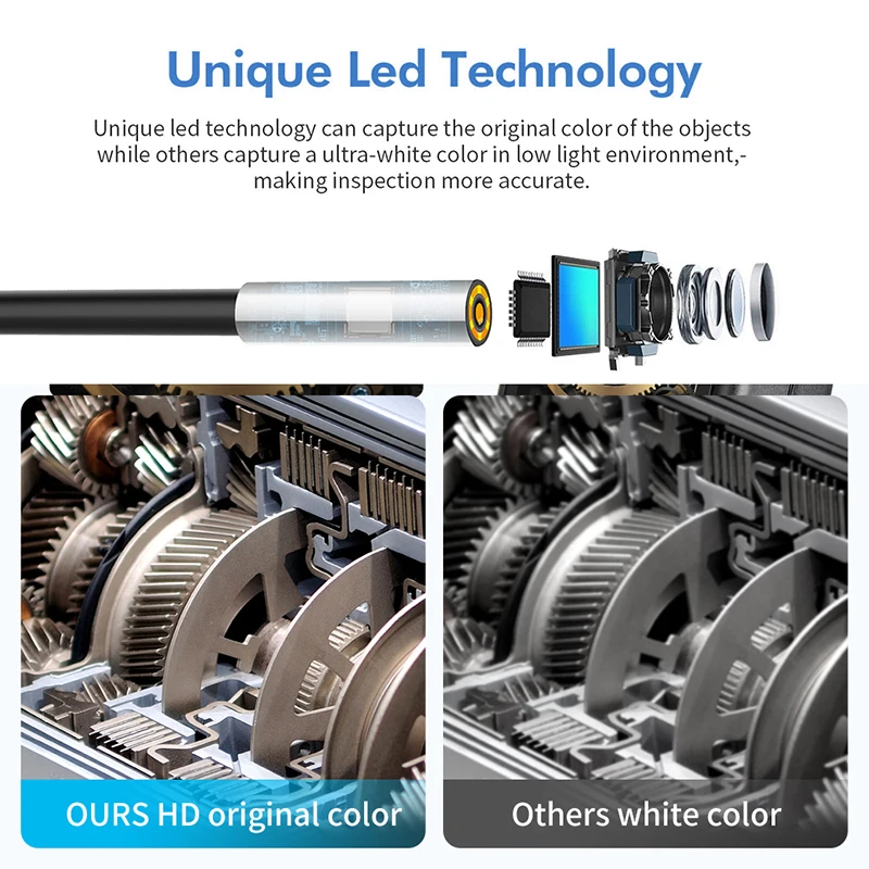 4. Простота в эксплуатации: вы можете использовать его сразу же после включения питания, не нужно устанавливать какое-либо приложение. Не нужно использовать ваш смартфон для подключения Wi-Fi, поэтому вам не нужно беспокоиться о грязном вашем дорогом телефоне на работе. Камера Borescope поддерживает съемку и запись видео.