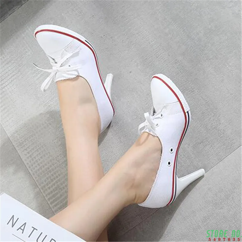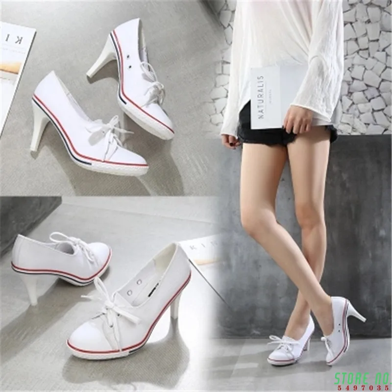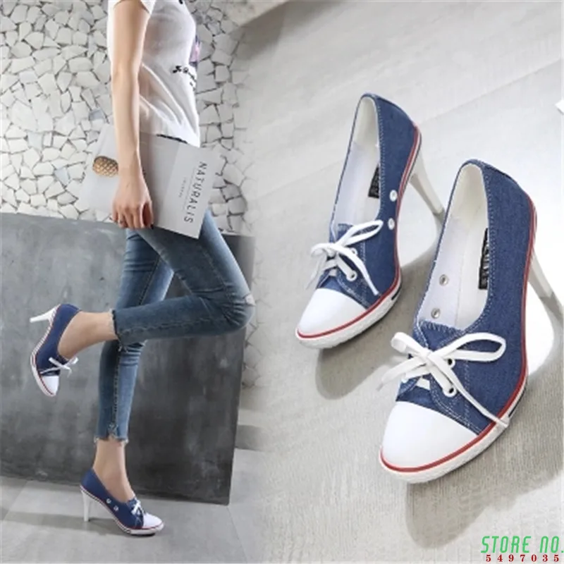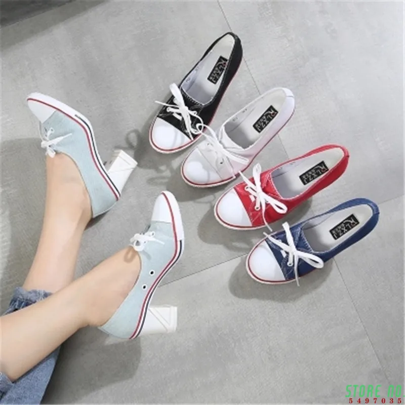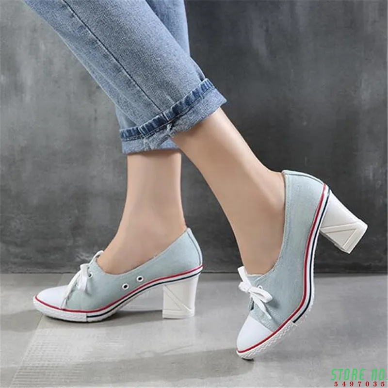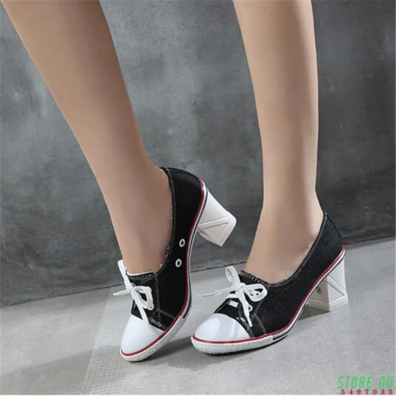 2021 г. Туфли-лодочки размер 34-41 женская обувь высокого качества из денима с закрытым носком Женская парусиновая обувь для учащихся на высоком каблуке 6-8 см