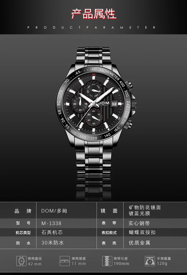 Роскошные мужские часы DOM, мужские водонепроницаемые часы с датой, мужские спортивные часы, мужские кварцевые наручные часы 1338