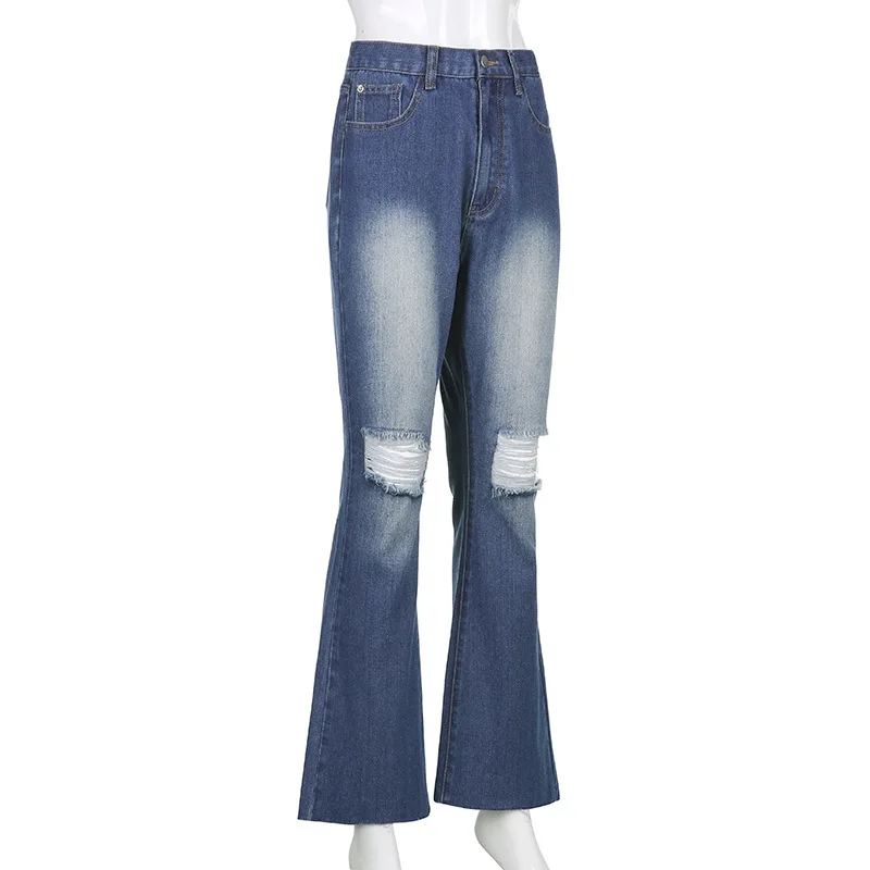 Рваные рваные расклешенные женские джинсы 2021 модные тонкие сексуальные с высокой талией уличные классические обтягивающие брюки y2k