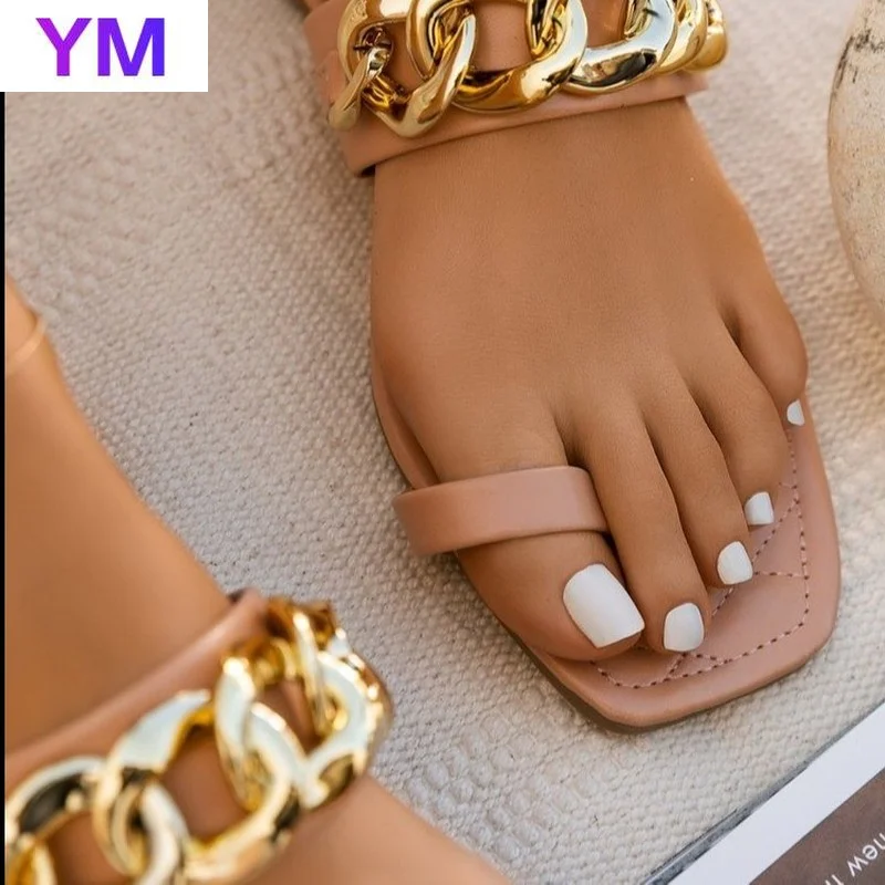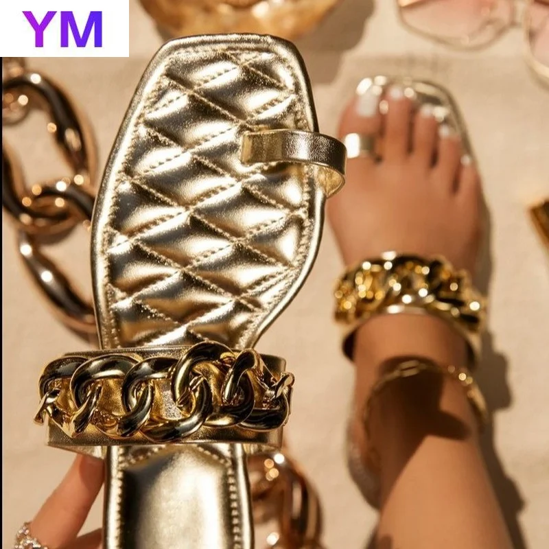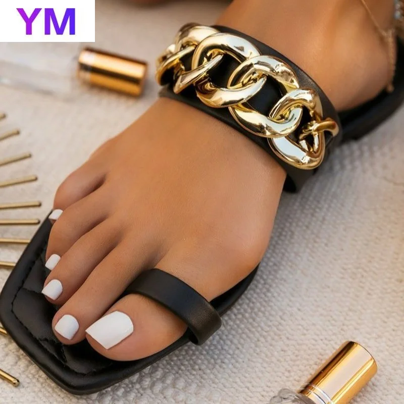 2021 новые женские шлепанцы на плоской подошве цепь черного металла Украшенные без каблука женские туфли без задника домашние тапочки; Zapatillas Casa; Mujer; Sapatos Femininos; Большие размеры 36-43