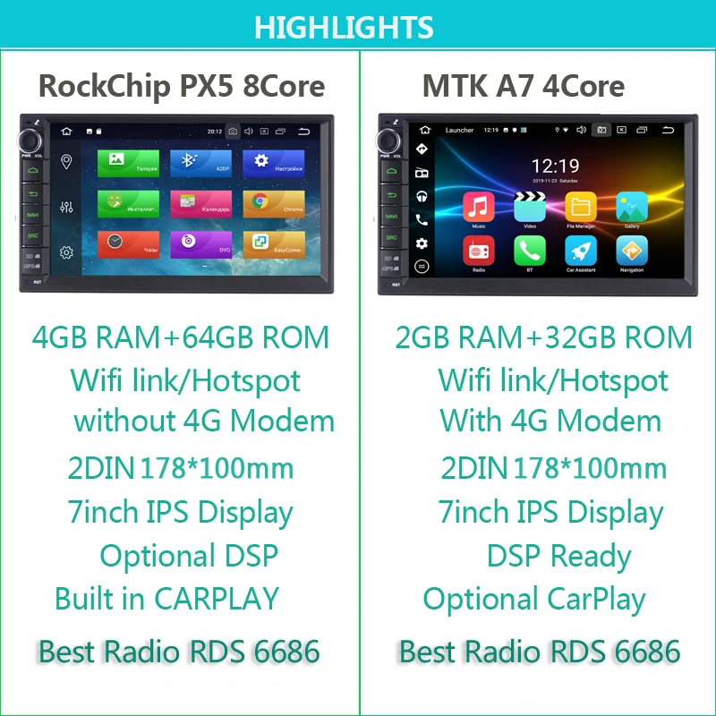 ** Из-за глобальной нехватки чипов, функция SD READER отменяется с 2021-05-01 **----> У этой модели нет dvd-плеера.----> Эта модель поддерживает подсветку RGB, смотрите видео демонстрацию для справки, пожалуйста.----> Эта модель поставляется с чипом Amp1. Android 10,0 MTK8003 2 Гб RAM + 32 ГБ ROMAndroid 10,0 OS,ROCKCHIP PX5 OCTACORE 4 Гб RAM + 64 ГБ ROM.1024*600 7 дюймов IPS Дисплей.2. Проводка AV Power с разъемом ISO по умолчанию, удобно для настройки автомобиля.2. 2 DIN стандарт Универсальный, передняя панель 178x100мм.3. Встроенный WiFi модуль и готовый 4G ключ4. Рынок GOOGLE PLAY5. 2xusb порта, встроенный Видеорегистраторы для автомобилей Системы (работа с дополнительным USB камера)