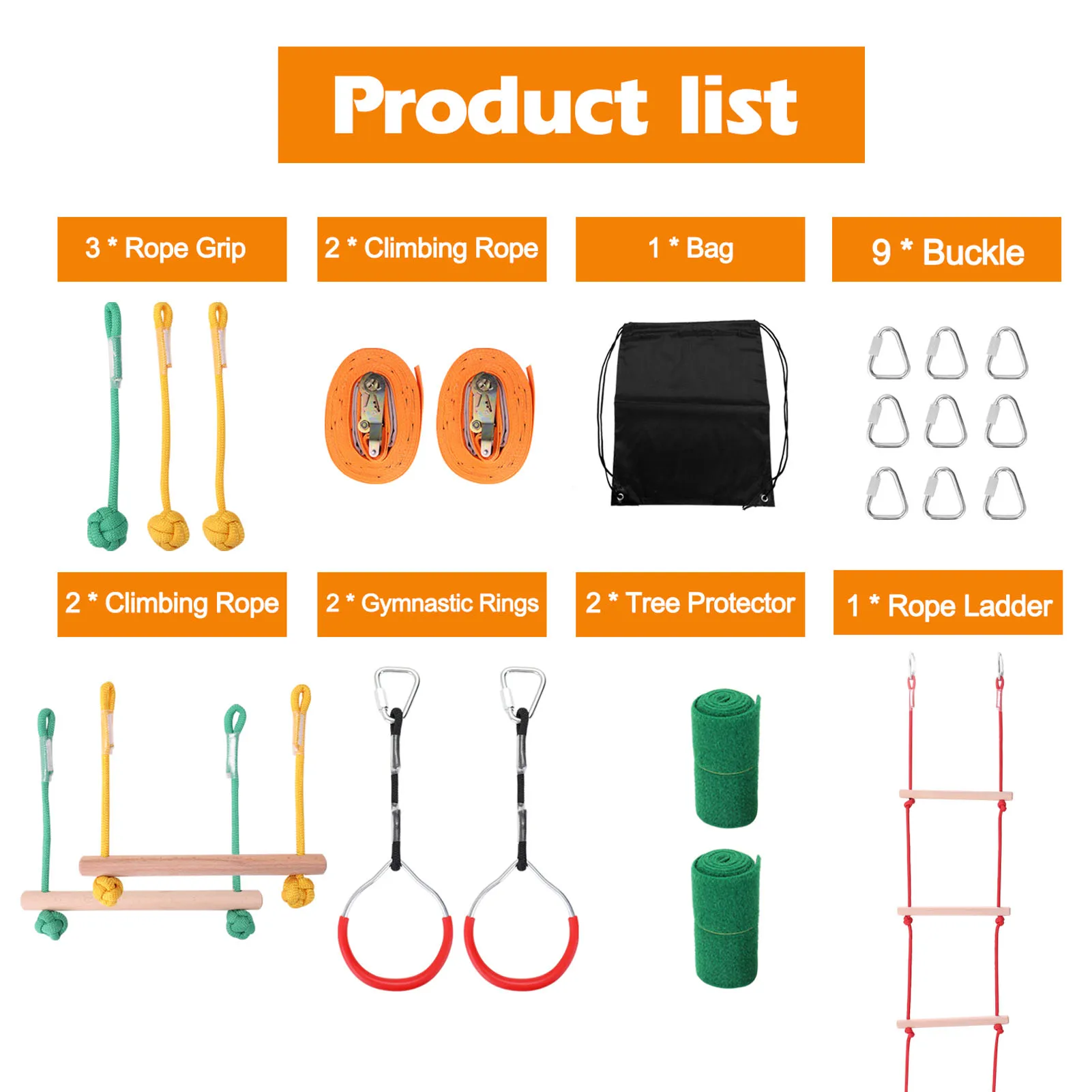 Этот уличный Детский комплект для расширения предоставляет детям различные упражнения, инструменты для скалолазания, способны развить детскую координацию, смелость и физическую силу.Особенности:Многофункциональность: включает в себя различные аксессуары и оборудование, предоставляет детям множество развлечений, способствует общению между родителями и детьми, стимулирует интерес детей.Хороший несущий эффект: Максимальная несущая конструкция: 250 фунтов и ниже, отвечает потребностям большинства пользователей.Способствует физической координации: детские упражнения для скалолазания могут улучшить физическую координацию ребенка, что делает детей более гибкими и подвижными.Смело и уверенно: в процессе скалолазания дети могут тренировать способность преодолевать трудности, накапливать опыт, повышать навыки, заставлять детей стать храбрыми и уверенными в себе.Улучшение физической формы: это может воспитать интерес детей к фитнесу, Улучшить физическую форму.Безопасный и нетоксичный: альпинистский набор изготовлен из высококачественного материала, поэтому он нетоксичен, безопасен и надежен.Использование в помещении и на улице: альпинистский набор можно устанавливать не только в спортивном месте на открытом воздухе, но и в домашнем месте, что очень удобно в использовании.Характеристики:Материал: полиэстер + дерево + металлДлина ремня: 13,5 МДлина веревочной лестницы: 1,6 мДлина троса: 290 мм/дюймаСкалолазание: 300*280 мм/11,8 * дюймаДлина гимнастических колец: 340 ммПосылка: 400*310*110 мм/15,7*12,2 * 4.3inВес посылка: 4395 г/фунтаПримечание:Чтобы быть более безопасными, дети должны играть под присмотром своих родителей.Упаковочный лист:1 * веревочная лестница3 * веревочный захват2 * ремень1 * сумка2 * скалолазание2 * гимнастические кольца2 * защитное покрытие для дерева9 * пряжка
