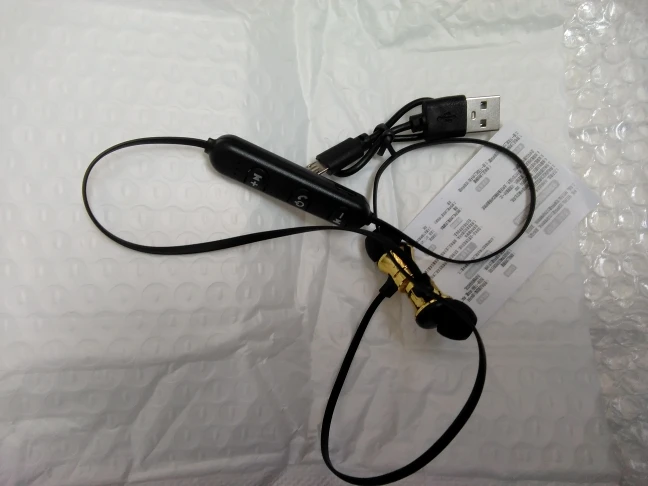 Наушники беспроводные за 75 копеек. Доставка не долгая и бесплатная. Упакованы в пакетик вместе с инструкцией на английском, китайском и зарядкой. Общая длинна примерно 55 см. Звук, что не удивительно ужасный, моно. Но это оправдывается ценой. В итоге наушники, несмотря на звук неплохие, подключаются и работают.