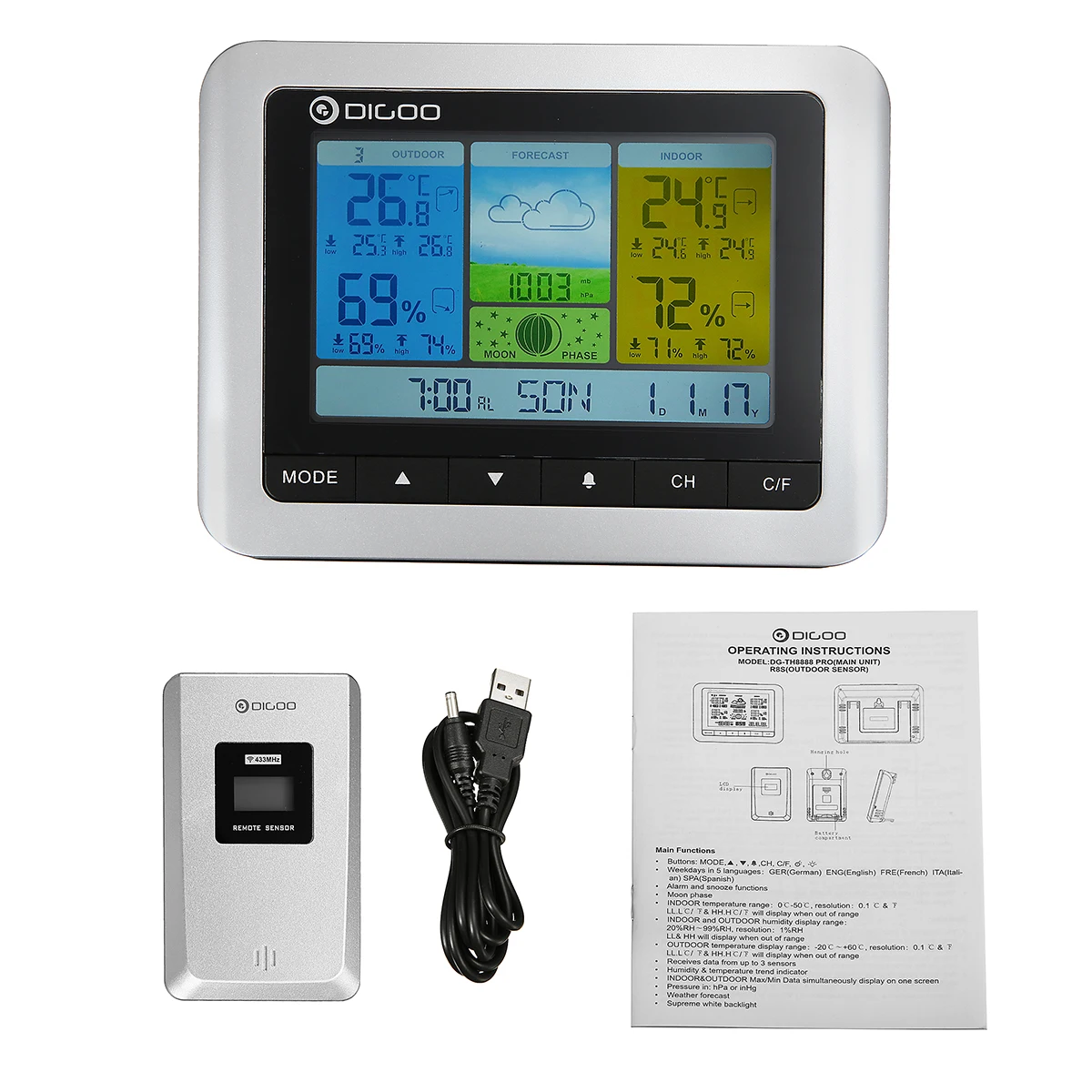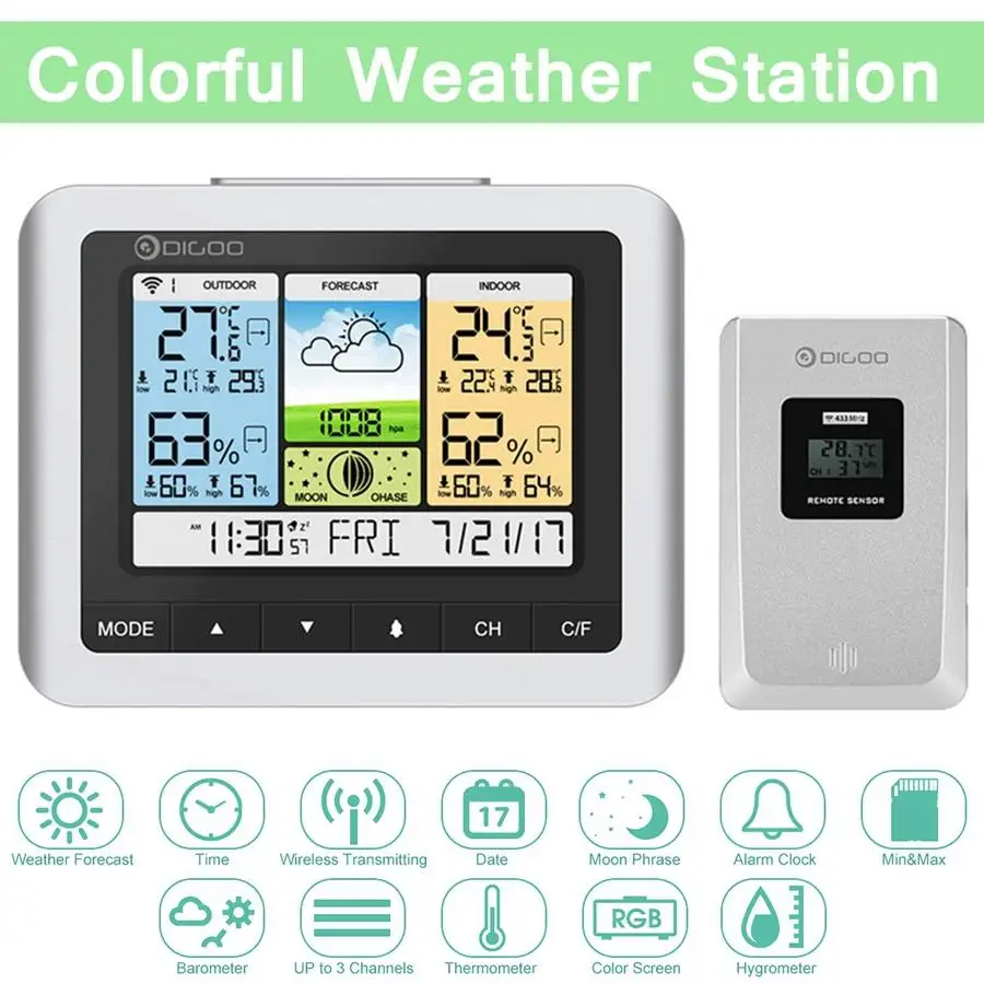Digoo DG-TH8888 часыПогодная станция + погоды Сенсор Открытый USB Беспроводной цифровой термометр измеритель влажности 3CH Луна фразу
