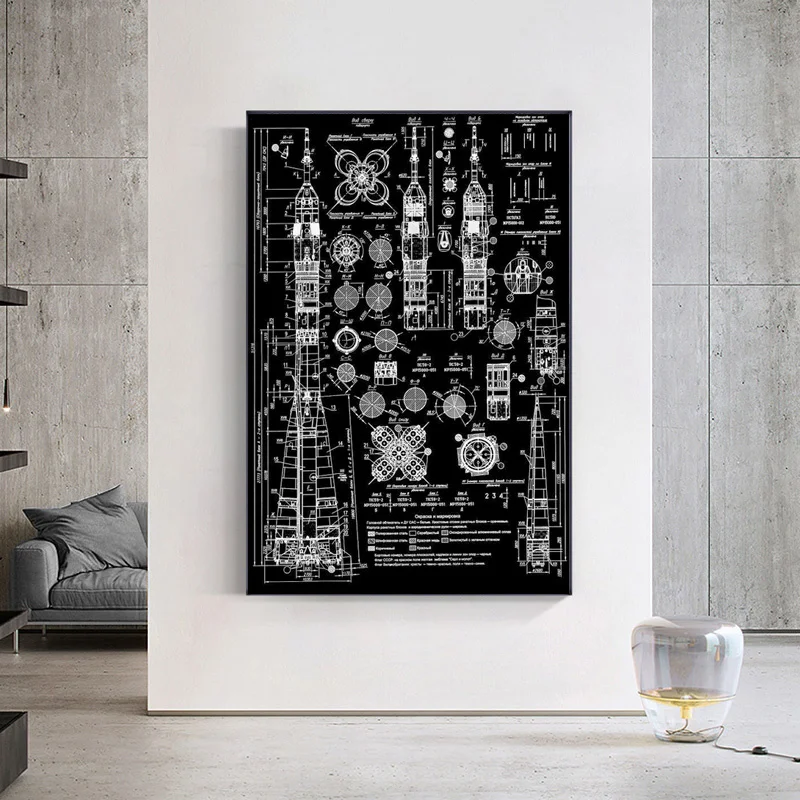 Картина на холсте с изображением ракеты, черного и белого цвета