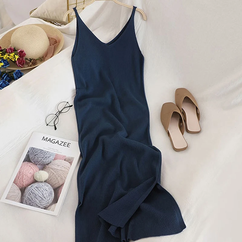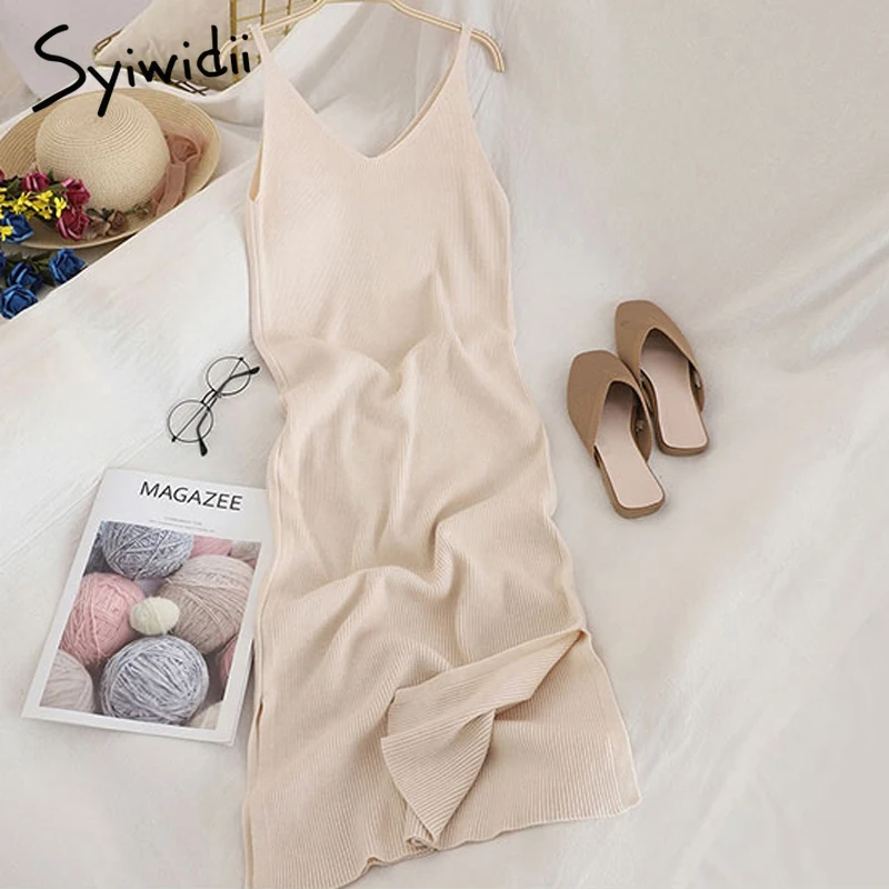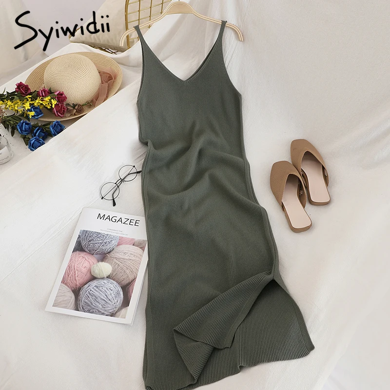 Женское трикотажное платье на бретельках Syiwidii, однотонное зеленое платье без рукавов, с Боковым Разрезом, с высокой талией, корейская мода, лето 2021