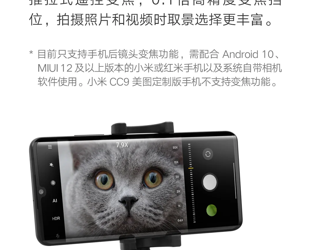 Он поддерживает функцию зума заднего объектива мобильных телефонов. Он должен использоваться с мобильными телефонами Xiaomi или Redmi с Android 10, MIUI 12 или выше и собственным программным обеспечением камеры системы.Версия Mi cc9 Meitu custo mi zed не поддерживает функцию зума.