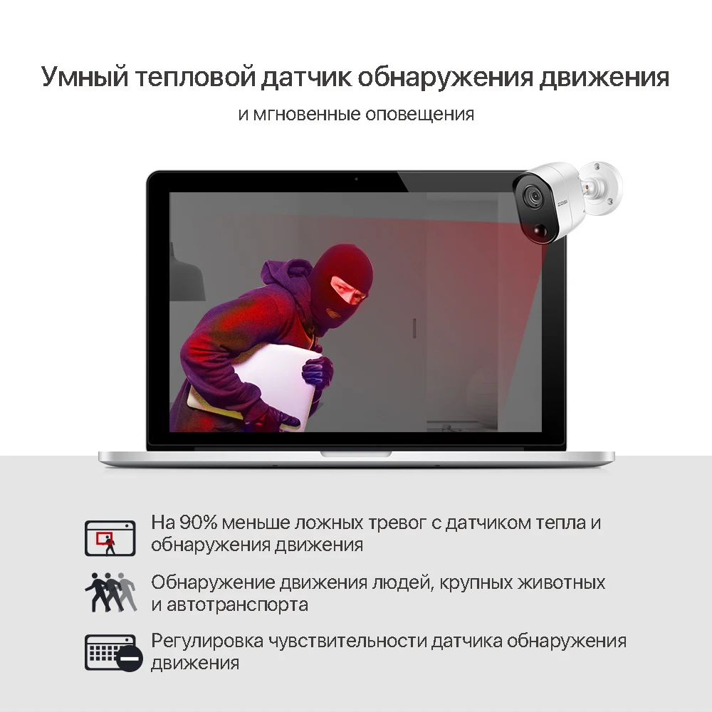 Высокочувствительный датчик движения PIR безошибочно определяет движение в кадре, вызванные людьми. Датчик фиксирует движение от человека и животного и в этот же момент отправляет на ваш телефон уведомление о тревоге. Датчик позволяет избежать ложных тревог, тк он не реагирует на не живые предметы - ветки, летающие пакеты или автомобили. Вы также можете настроить зоны обнаружения с вашего видеорегистратора, чтобы минимизировать ложные сигналы тревоги.