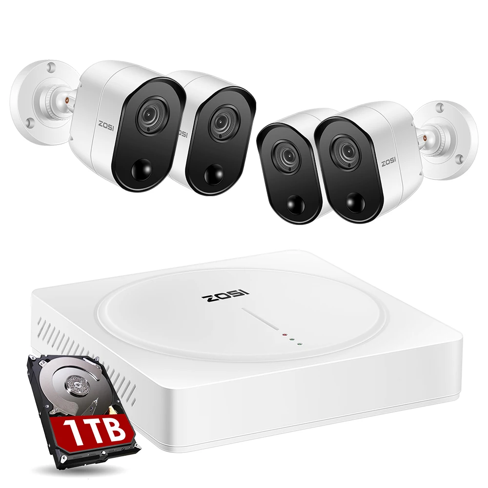 Система видеонаблюдения ZOSI Super HD, H.265 + 4-канальный видеорегистратор с жестким диском ТБ и (4) x 5 МП, камеры безопасности с PIR датчиком движения