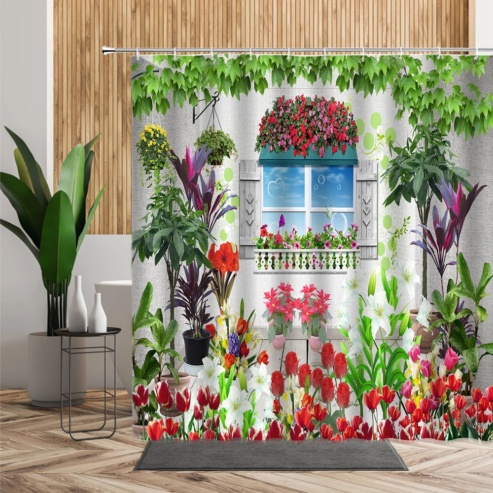 Весенняя садовая занавеска для душа с зелеными растениями, цветы, г...
