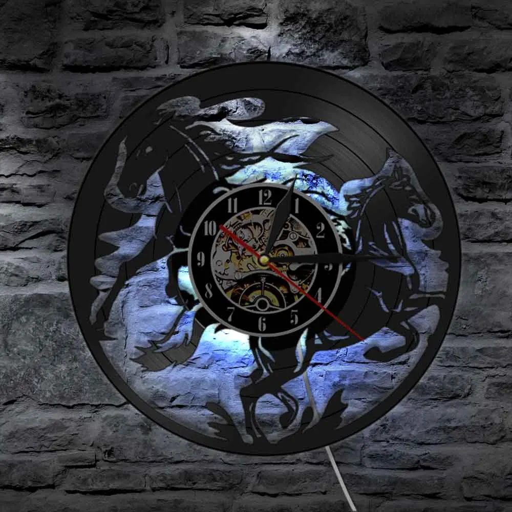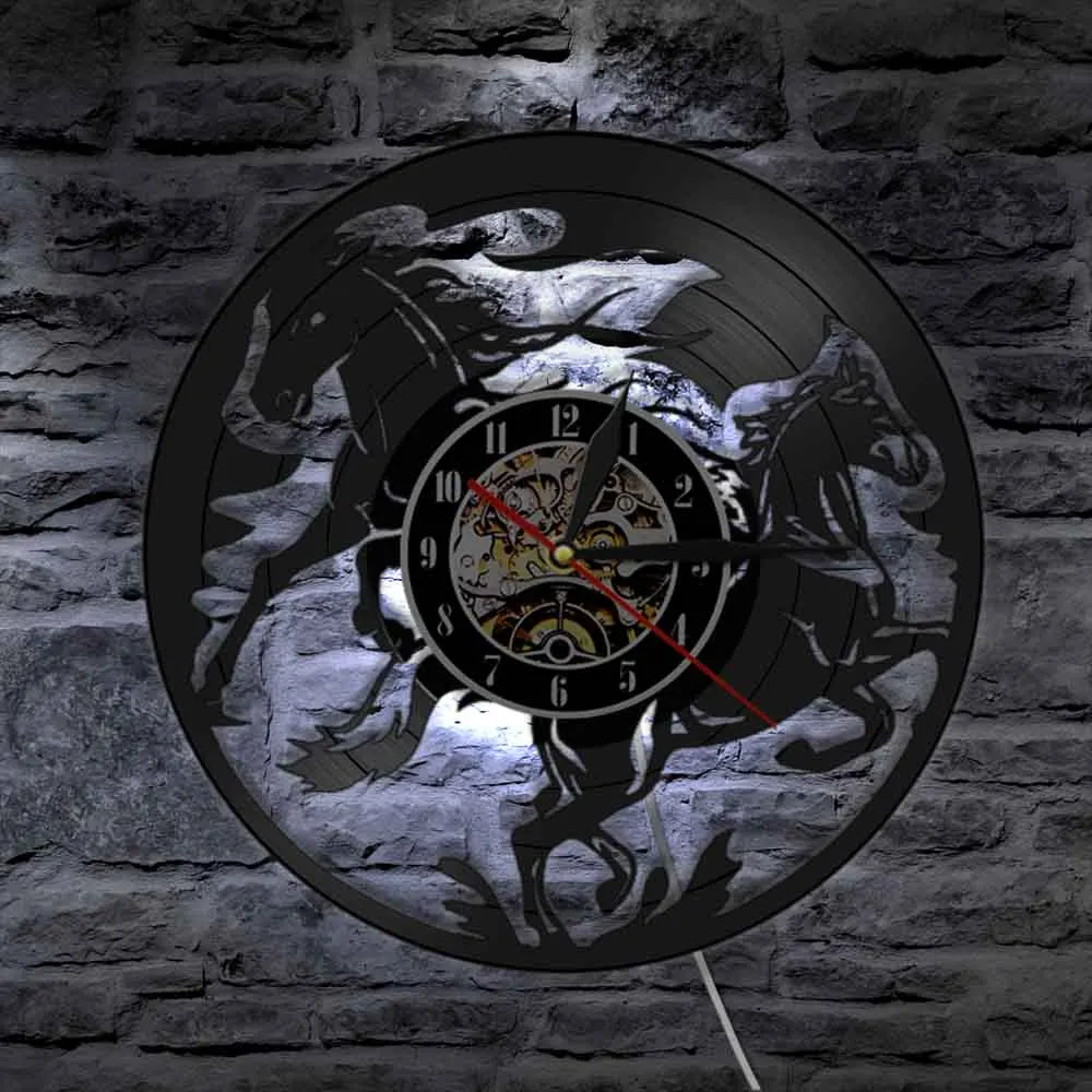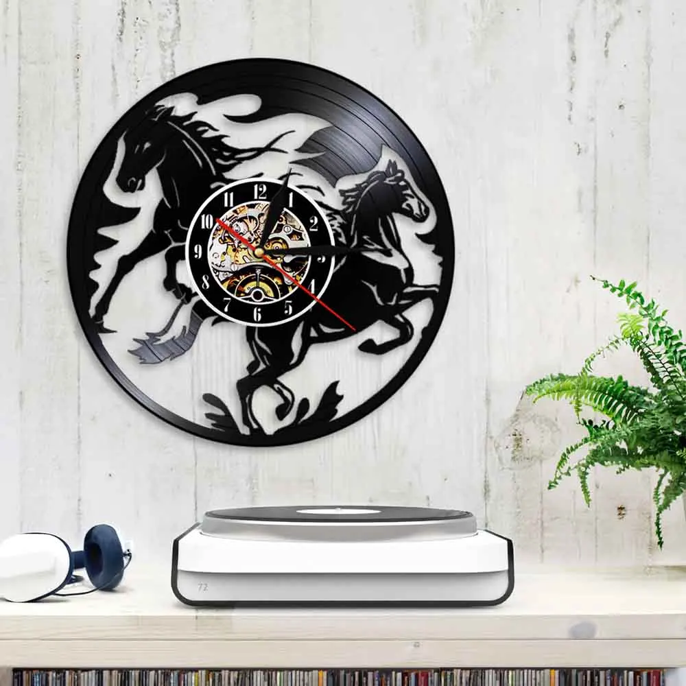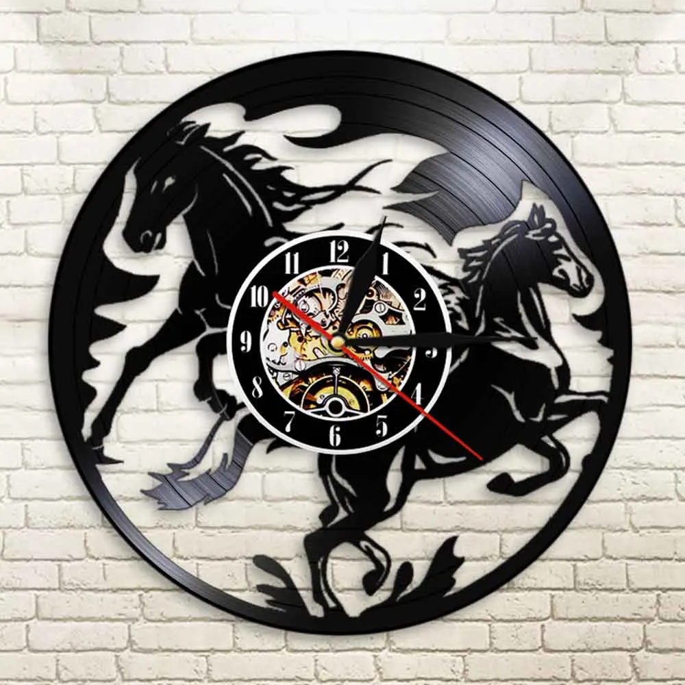 Настенные часы с изображением черных лошадей, сделанные из реальной виниловой пластины, Дикая езда, стабильный интерьер, домашний декор, музыкальный альбом в стиле ретро, тихие часы LP