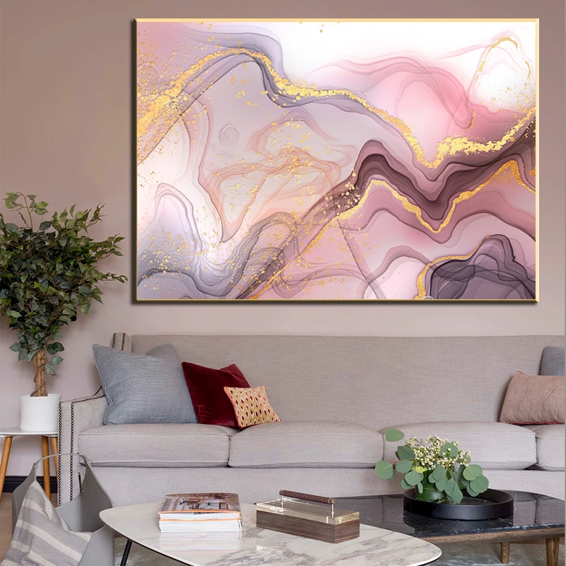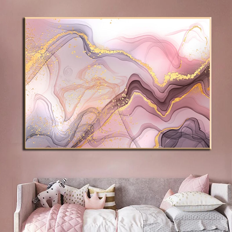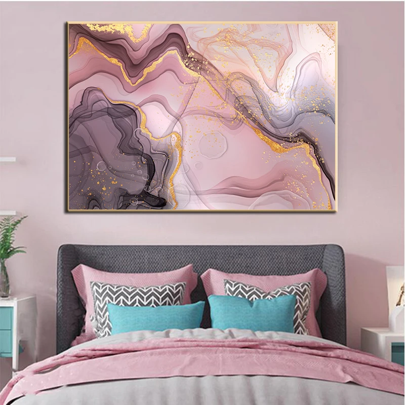 Абстрактная картина с изображением розового мрамора, современный постер золотого и фиолетового цветов, скандинавский Декор для гостиной, печать, Картина Настенная