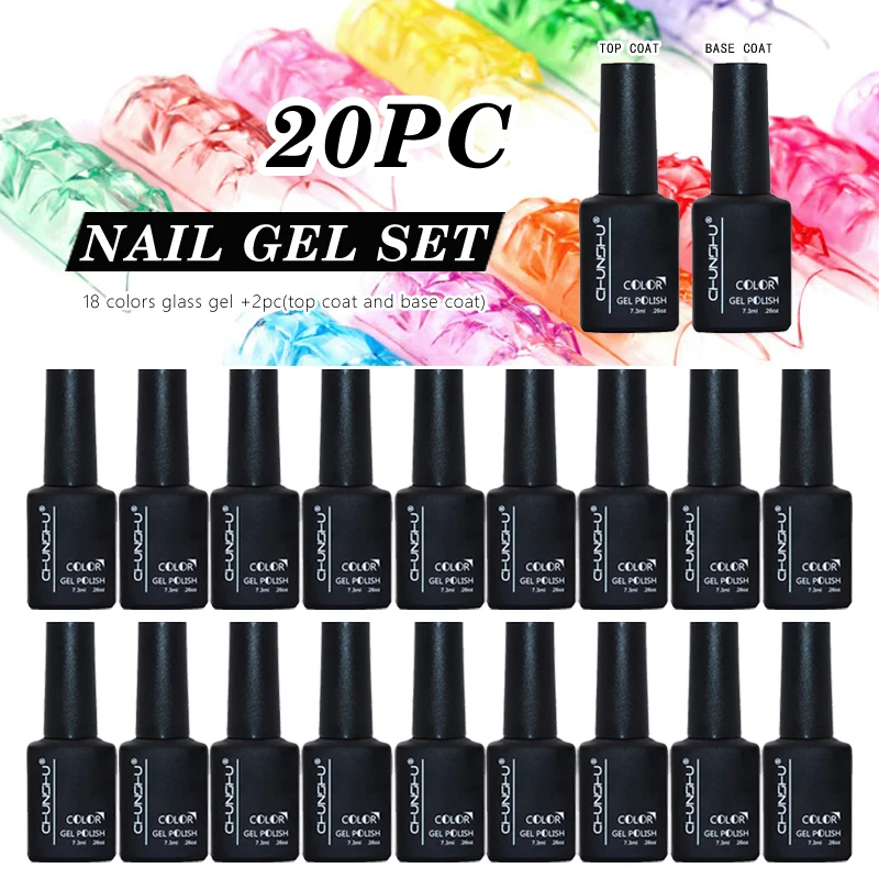 Новый 20 шт. набор для ногтей Светодиодный УФ-гель для ногтей лак для верхнего и базового покрытия, популярное флисовое пальто глазури Стекло Лаки янтарь, Гель-лак для ногтей, лак для ногтей дизайн сделай сам