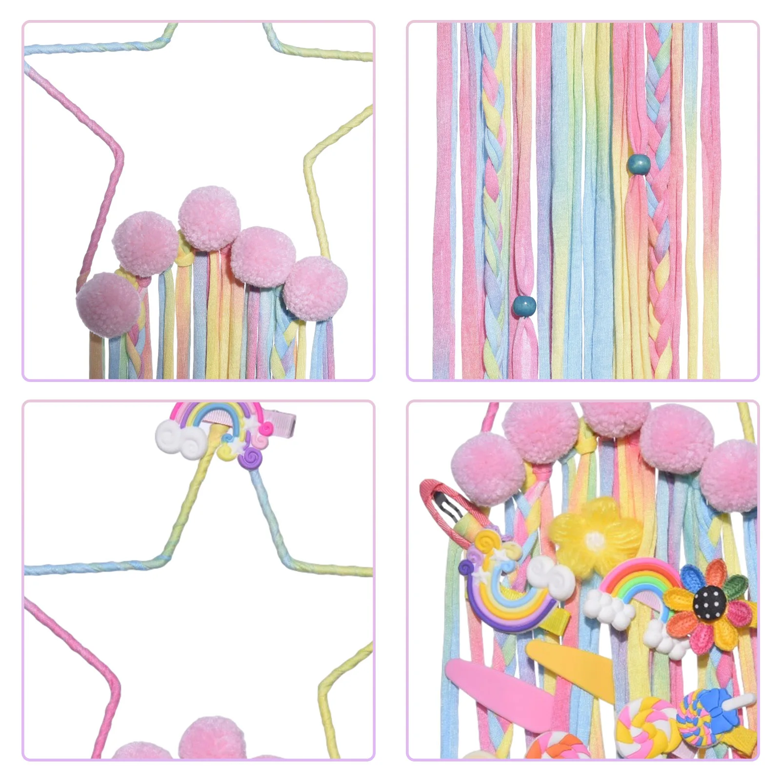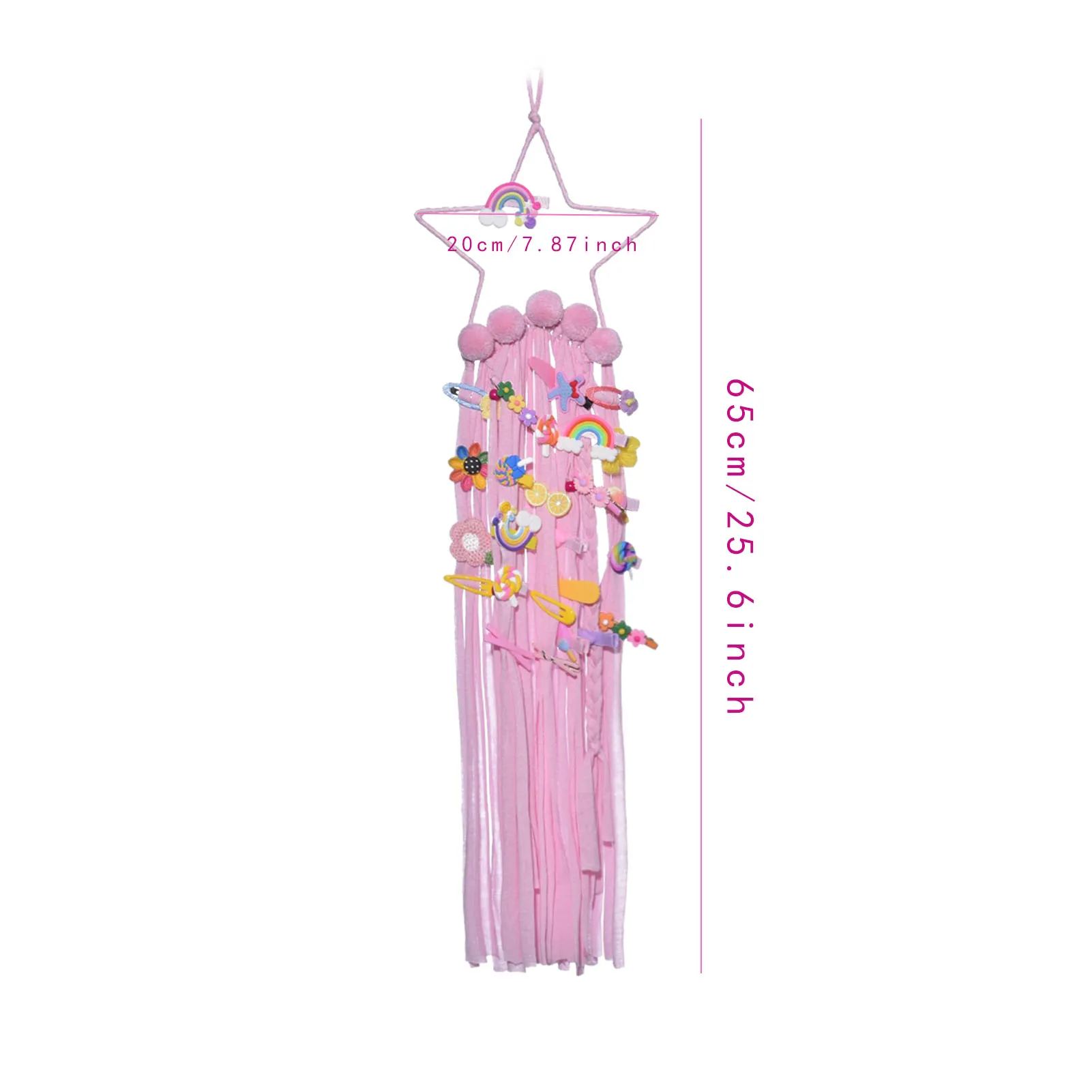 Точки пули:1. Интересный дизайн: милая пятиконечная звезда, пушистый маленький шарик, красочная веревка, хороший выбор для сезонного и праздничного украшения или детской комнаты.2. Хранение шпильки: вы можете закрепить шпильку для маленькой девочки на кисточкой из радужных ювелирных изделий и получить потрясающий визуальный эффект при одновременном хранении. (Без шпильки).3. Ручная вязка, Ловец снов, ювелирные изделия: доступны различные цвета, розовый, фиолетовый и цвет, идеальный зажим с бантом для маленьких девочек, идеальное украшение для детских комнат.4. Размер изделия: около 65*20 см, цветные украшения со звездами, яркие цвета, очень подходят для украшения комнат для девочек и создания расслабляющего ощущения в любой комнате.