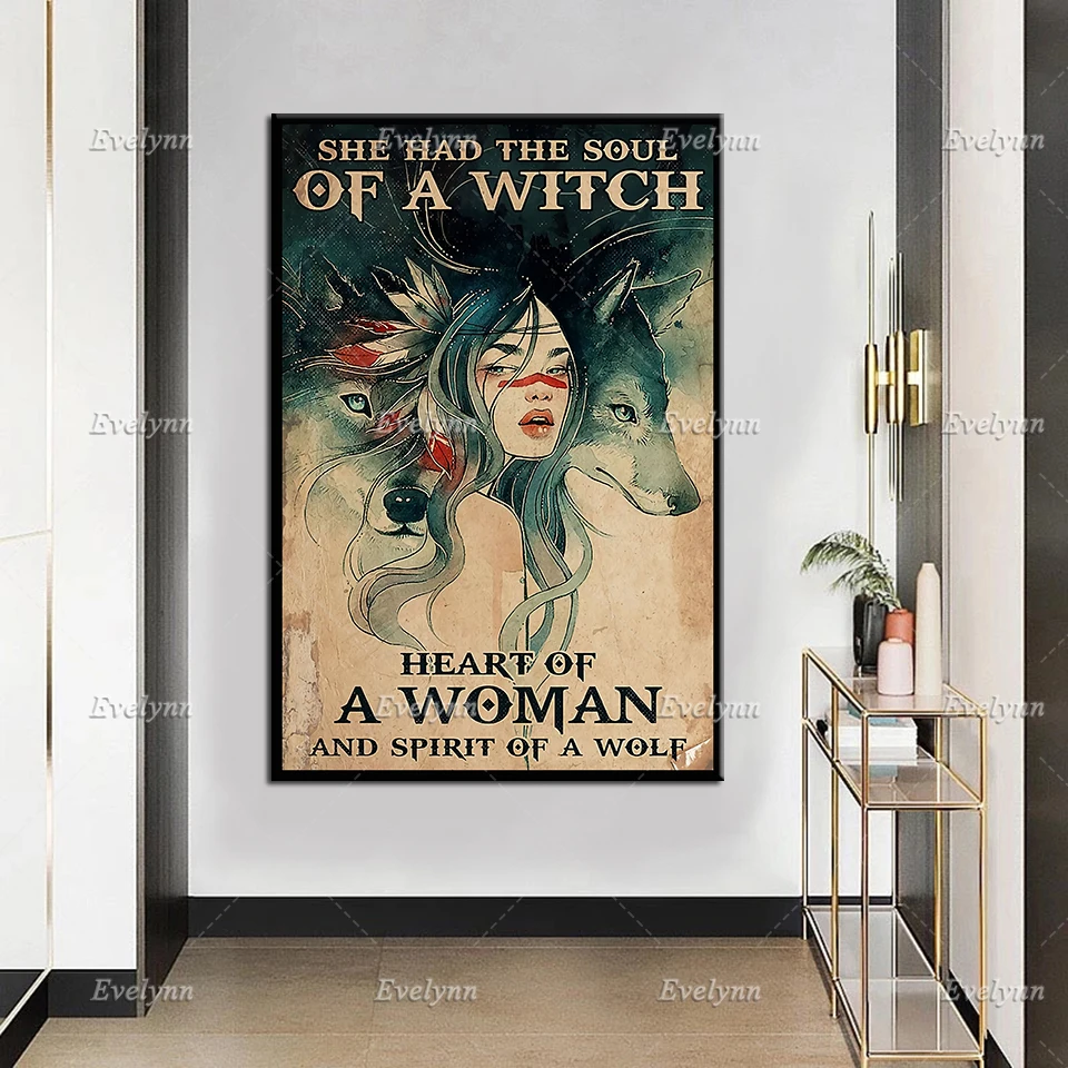 Плакат ведьмы-она держала душу ведьмы сердца Женщины и духа волка, волшебная Художественная печать, волк настенный художественный Декор