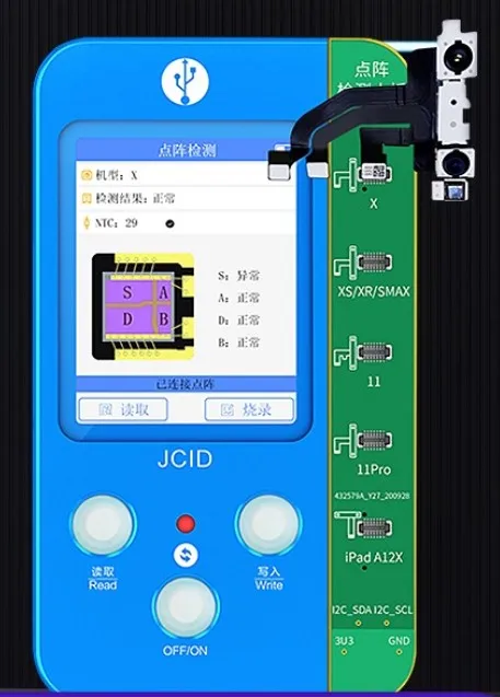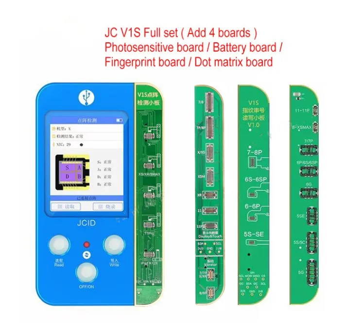 Описание:JC V1S для iPhone 7 8 8P X 11 12 фоточувствительная оригинальная цветная Truetone сенсорная ударная батарея отпечаток пальца SN программатор точечная матрица