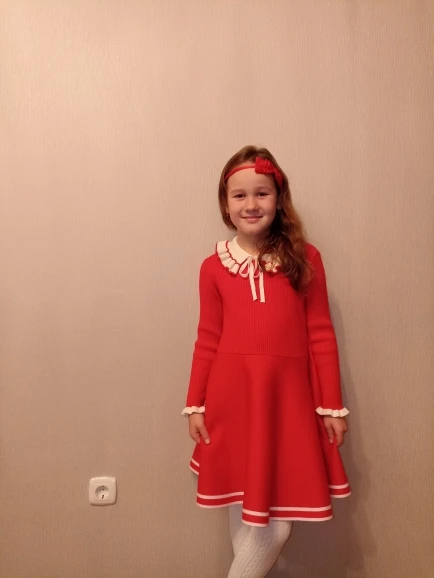 Здравствуйте!Платье неплохое.По весу тяжеловато,очень тёплое.Маломерит .На девочку 134 рост размер 12 только-только без запаса.Сзади в талии широковато,буду что-то придумывать.Смотрится нарядно.