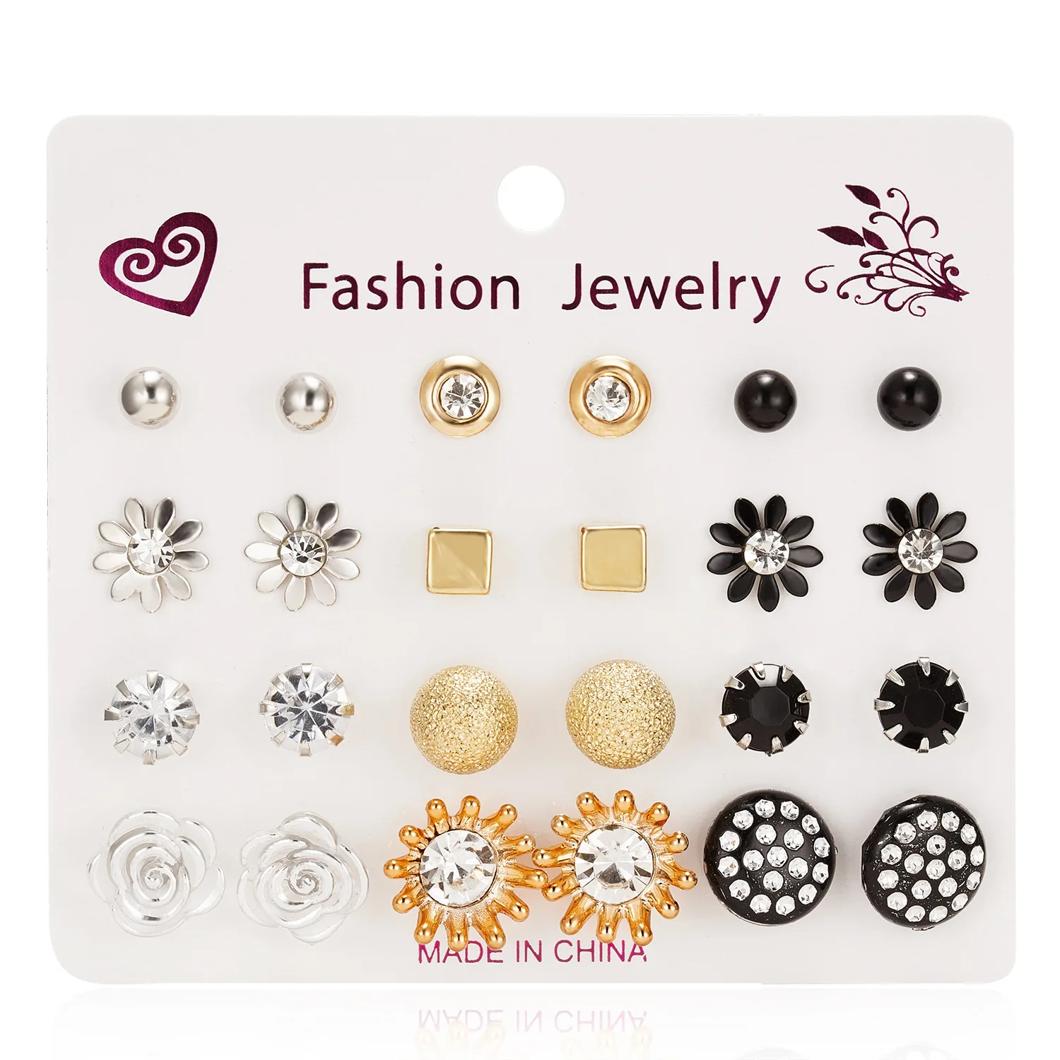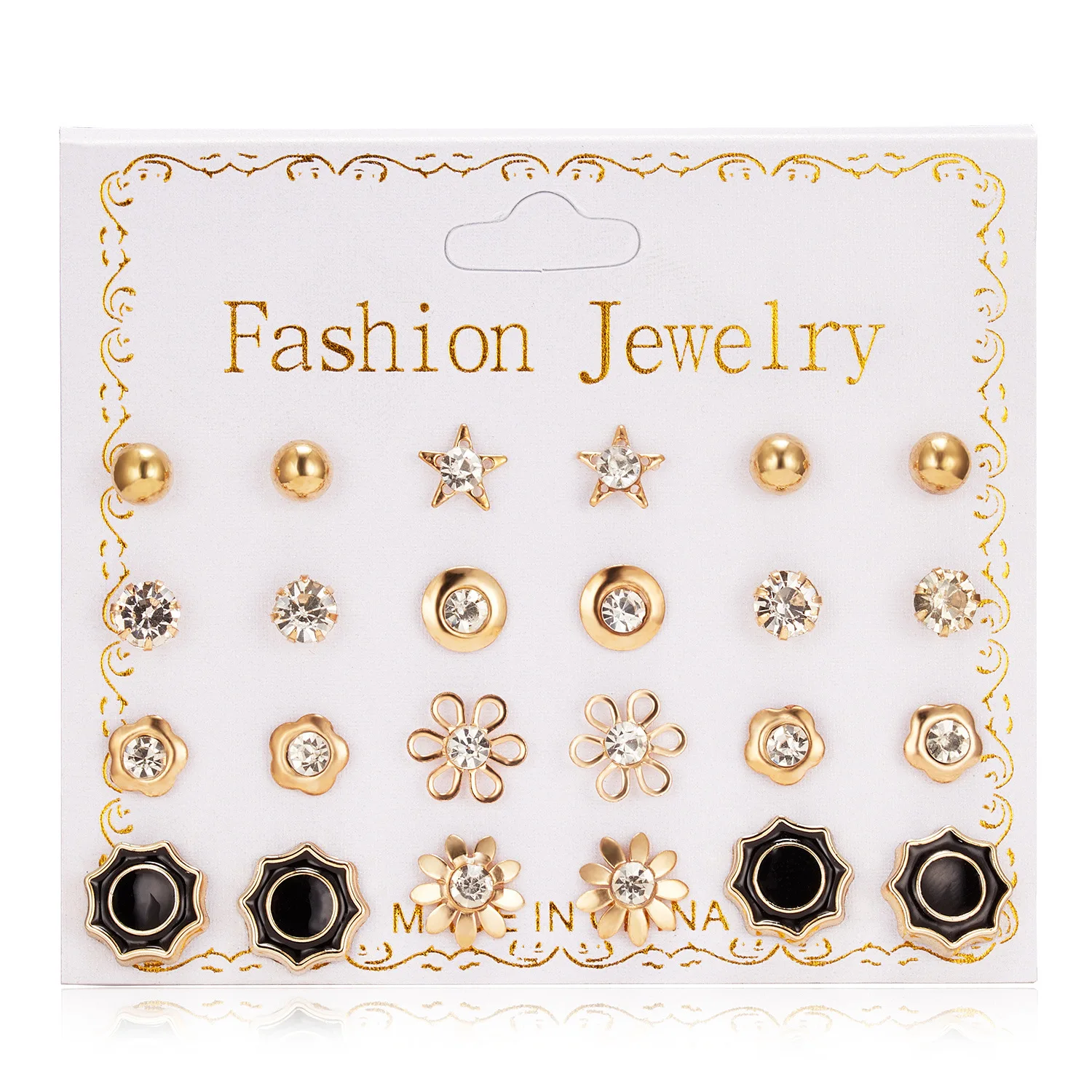 Набор сережек-гвоздиков с карточкой, 12 партийкомпл., прозрачные серьги с циркониевые шары сердечками и цветами, женские серьги с имитацией жемчуга, ювелирные изделия