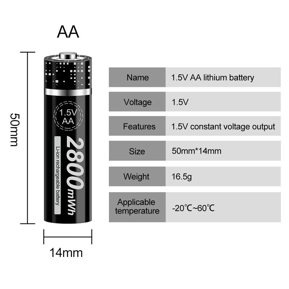 Название: 1,5 в AA литиевая аккумуляторная батареяВолит: 1,5 VМатериал: литий-ионный аккумуляторЕмкость: 2800mwhВес: 16,5 гРазмер: 50 мм * 14 ммХарактеристики: 1,5 В напряжение постоянного тока на выходеПрименимая температура:-20-60 ℃