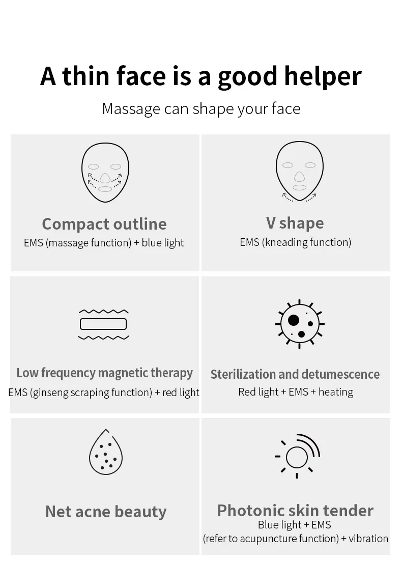 Массаж может сформировать ваше лицо Компактный контур EMS (функция массажа) + синий светильник V-образный EMS (функция разминания) Низкочастотная Магнитная терапия EMS (функция соскабливания женьшеня) + светильник Стерилизация и детумирование Светильник + EMS + нагрев Чистая красота акне Нежная фотонная кожа Синий светильник + EMS (см. Функцию акупунктуры) + вибрация
