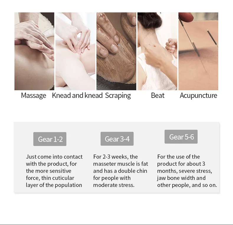 Шестерня 1-2 Просто соприкасайтесь с продуктом для более чувствительной силы, тонкий кутикулярный слой популяции Шестерня 3-4 В течение 2-3 недель мышца мазетра жира и имеет двойной подбородок для людей с умеренным стрессом. Шестерня 5-6 Для использования продукта около 3 месяцев, при сильном стрессе, ширине челюсти и других людей и т. Д.