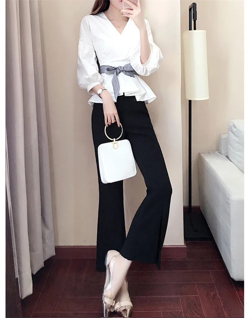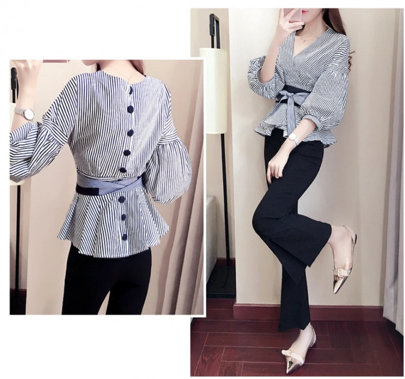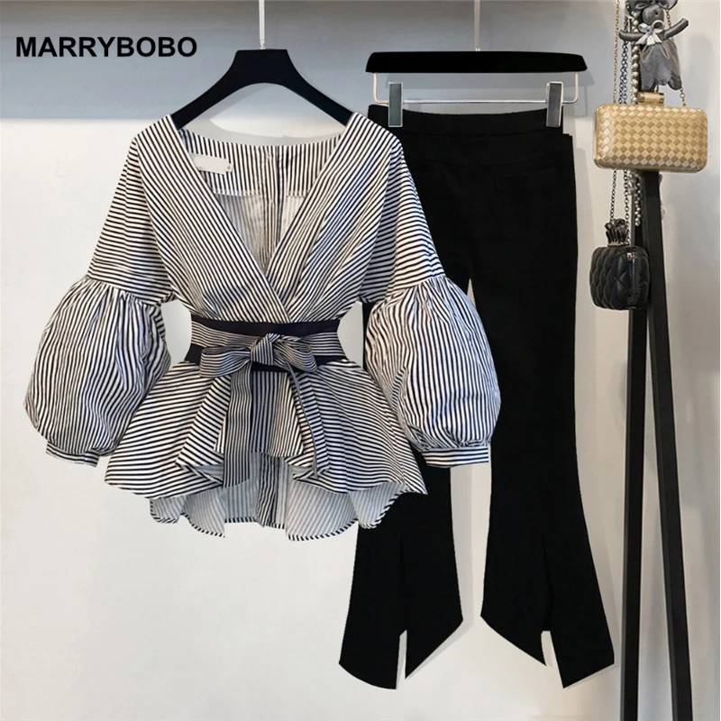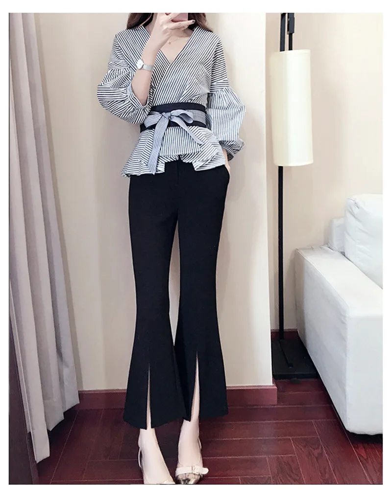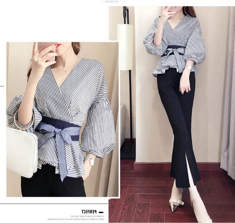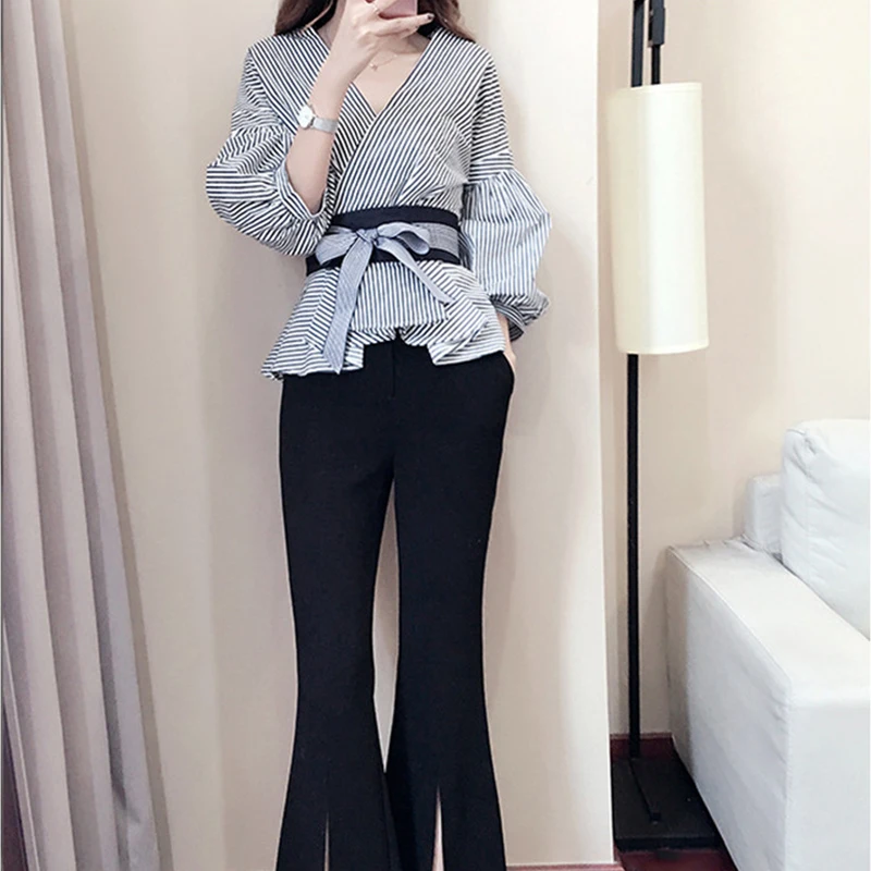 Женский офисный костюм из блузки и брюк-карандаш, элегантный костюм в полоску с рукавом-фонариком и V-образным вырезом, в Корейском стиле, 2021