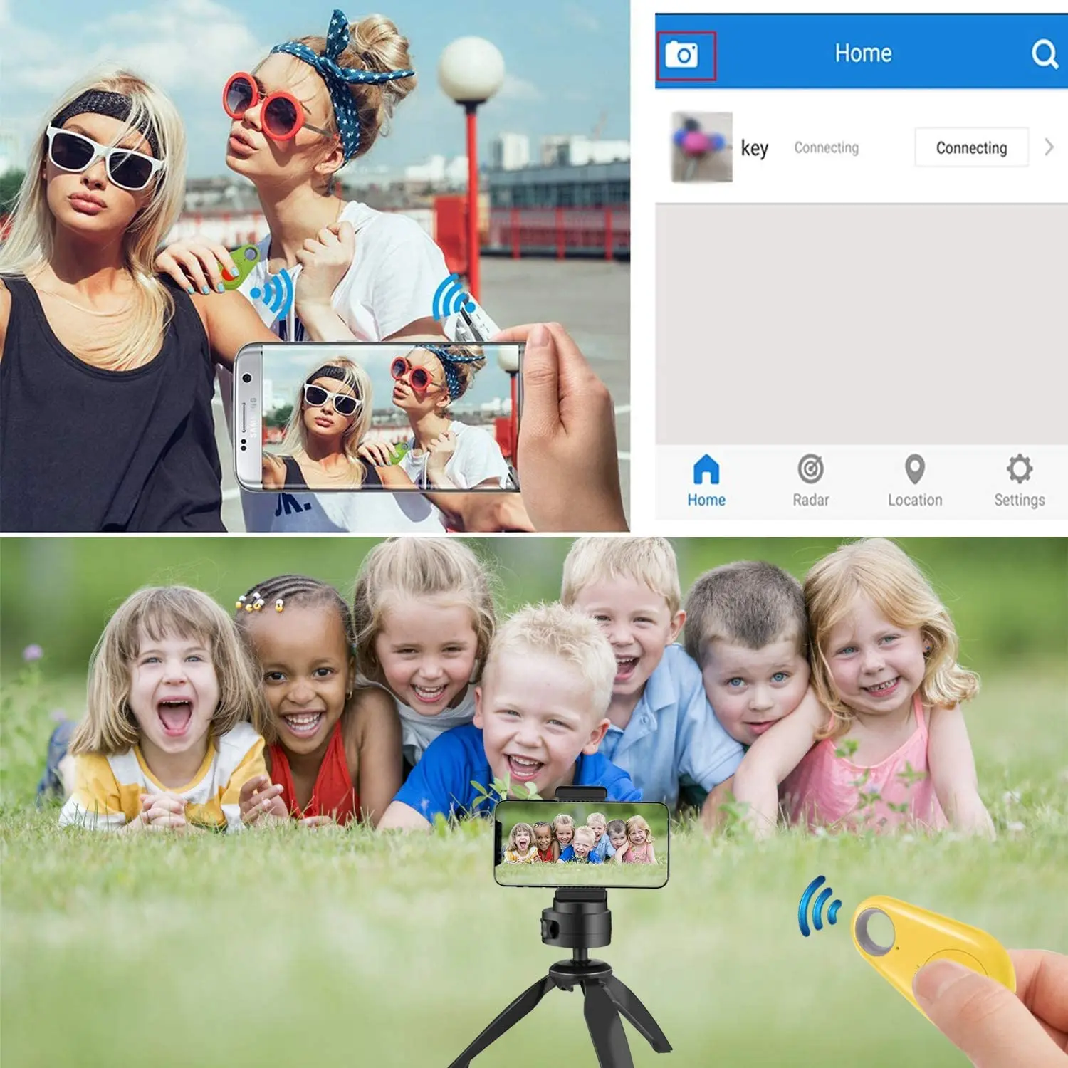 【Сделайте семейные фотографии и запись 】когда ключ-трекер подключен к мобильный телефон через Bluetooth, вы можете дистанционно управлять камерой устройства или запись голоса вашего телефона, нажав кнопку.