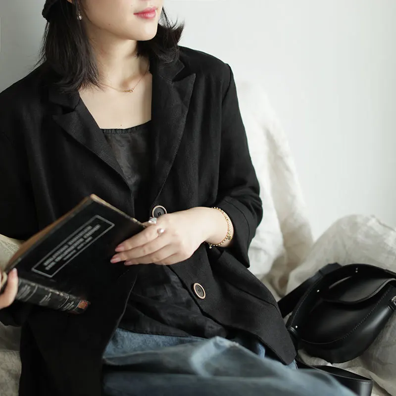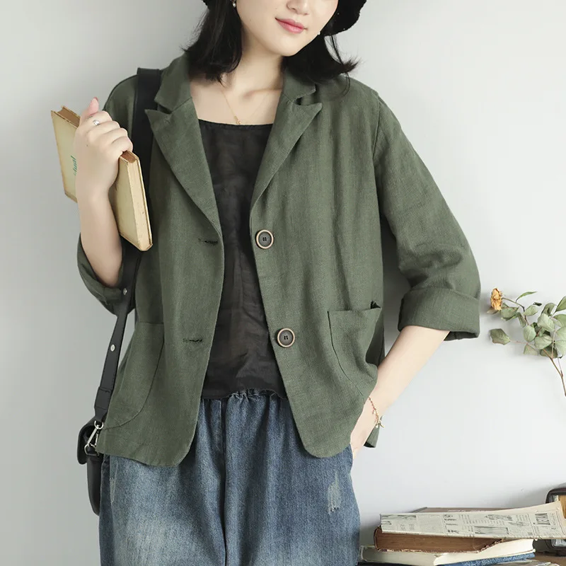 Женский Повседневный блейзер из хлопка и льна, куртки, Новый Винтажный однотонный свободный женский пиджак в простом стиле для весны, 2021