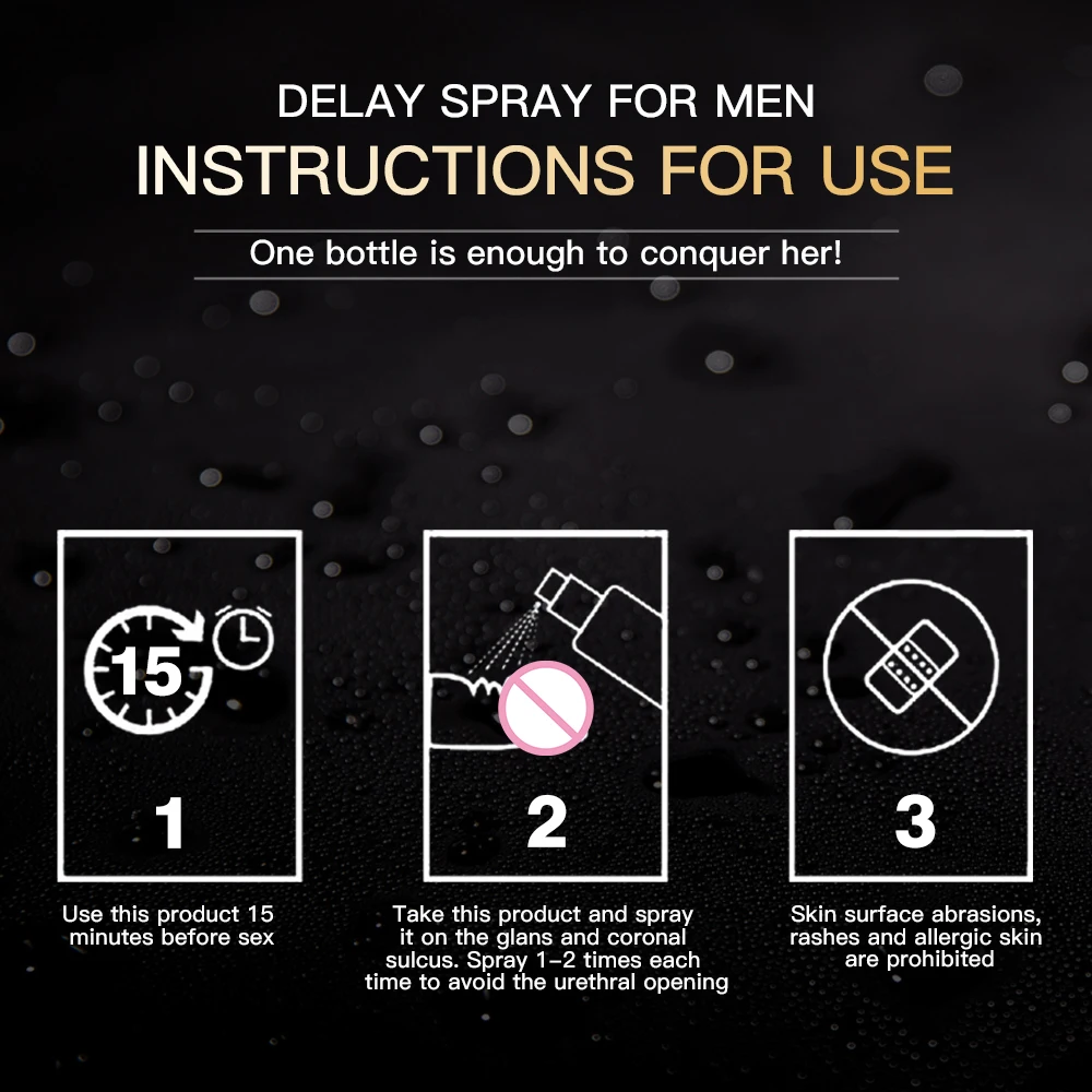 Распылите этот продукт на головку пениса и коронарный сулькус за 30 минут до полового акта, затем равномерно распределите, этот продукт действует в течение примерно 60 минут.