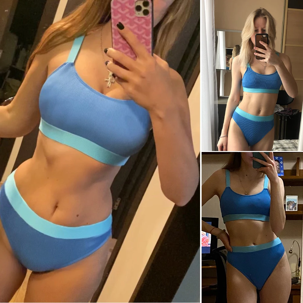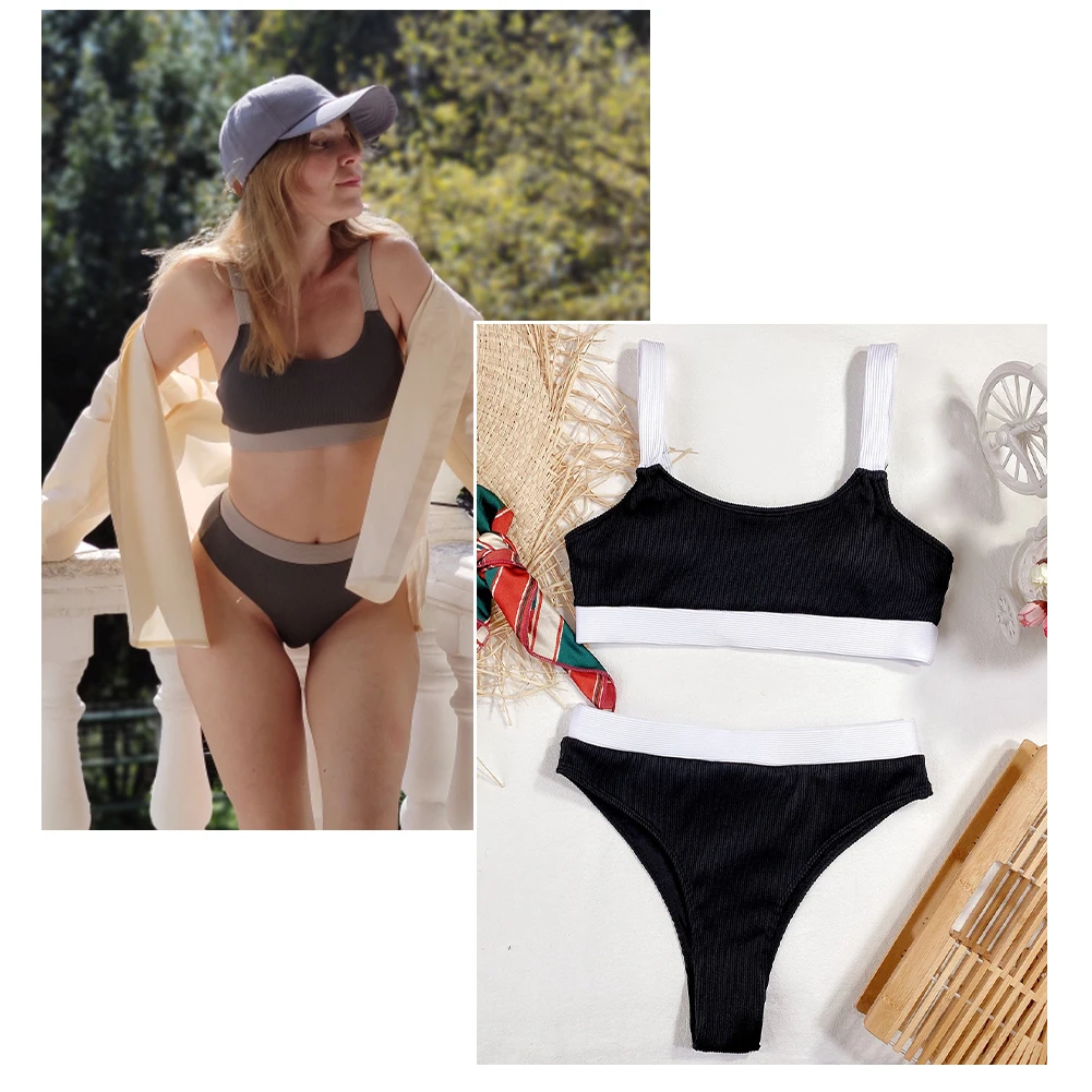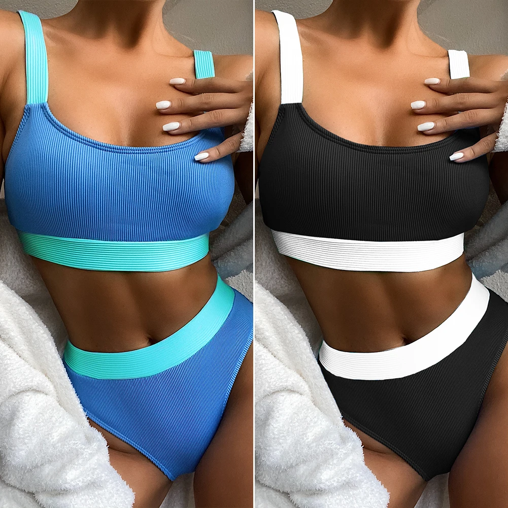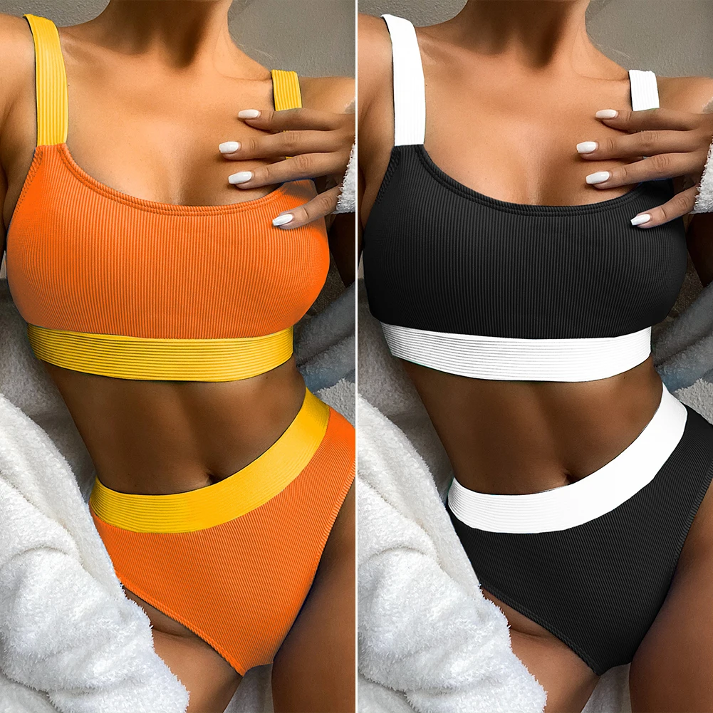 Сексуальный купальник Для женщин бикини комплект из 2 частей, пуш-ап, спортивный топ с высоким разрезом стринги Цвет контраст пляжная одежда купальные костюмы S-L