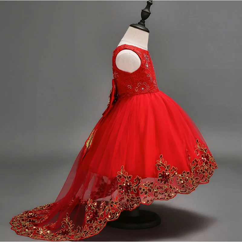 Красное розовое платье принцессы для детей от 2 до 12 лет нарядное элегантное платье с цветочным узором для девочек на свадьбу и Крещение Одежда с фатиновой вышивкой и бантом