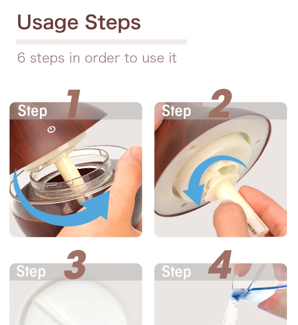 Важные вещи, которые вам нужно знать:1. Перед использованием увлажнителя, пожалуйста, убедитесь, что ватный тампон полностью погружен в воду, чтобы гарантировать, что влажный ватный тампон соприкасается с распыляющим листом и может излучать хороший туман. Пожалуйста, убедитесь в правильности работы, спасибо! (Если операция не правильная, это приведет к тому, что только светильник не будет запотевать)